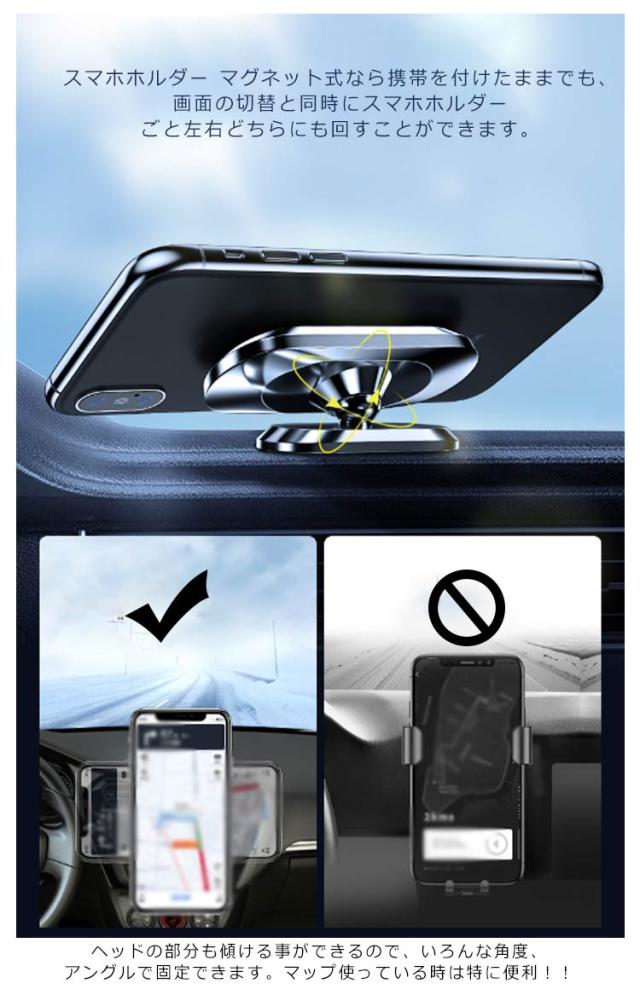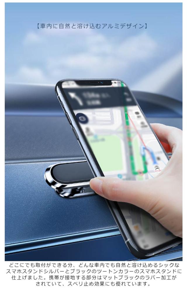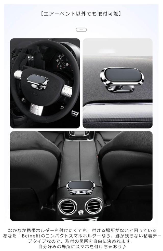 | 【車載ホルダー 便利なマグネット式】一度使ったら止められない便利さ!車に乗ったらスマホをピタッとそのままつける、磁石タイプのスマホ 車載 ホルダー。リリースボタンを押す煩わしさ一切ナシ。4個のS極と、4個のN極の計8個の強力マグネットでしっかりスマホを固定します。 【360度回転 クルマ用ホルダー】スマホホルダー マグネット式なら携帯を付けたままでも、画面の切替と同時にスマホホルダーごと左右どちらにも回すことができます。ヘッドの部分も傾ける事ができるので、いろんな角度、アングルで固定できます。マップ使っている時は特に便利!! 【エアーベント以外でも取付可能】なかなか携帯ホルダーを付けたくても、付ける場所がないと困っているあなた!Beingfitのコンパクトスマホホルダーなら、跡が残らない粘着テープタイプなので、取付の箇所を自由に決めれます。 自分好みの場所にスマホを付けちゃおう♪ 【車内に自然と溶け込むアルミデザイン】どこにでも取付ができる分、どんな車内でも自然と溶け込めるシックなスマホスタンドシルバーとブラックのツートンカラーのスマホスタンドに仕上げました。携帯が接地する部分はマットブラックのラバー加工がされていて、スベリ止め効果にも優れています。 【携帯ホルダーのサイズ】横約6cm x 縦約2.4cm x 奥行き1.9cm、重さはたったの57gととコンパクトで軽量。付属品:アルミボディの車載ホルダー マグネット 1個、スチールプレート 2個が含まれます。両面テープを貼り付ける面の油、ホコリや汚れは予めよく落としてからお使い下さい。装着する面が汚れていると剥がれる原因となります。 | |