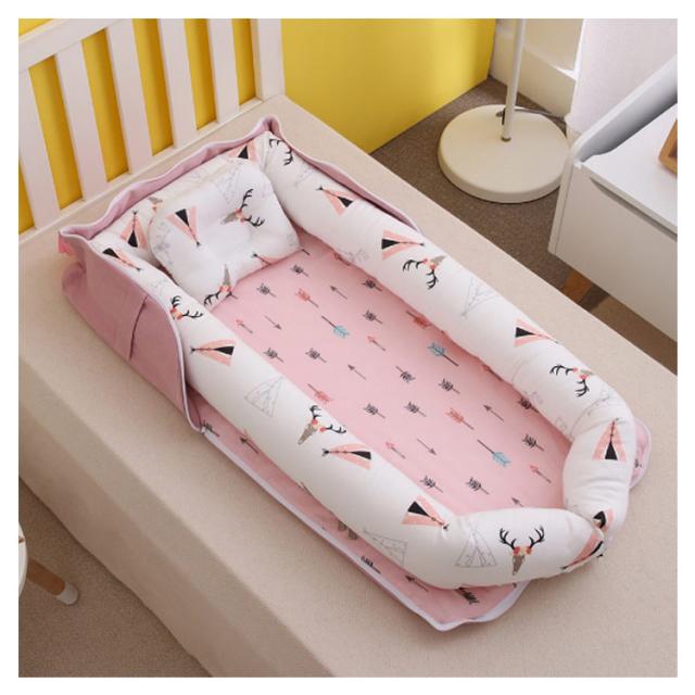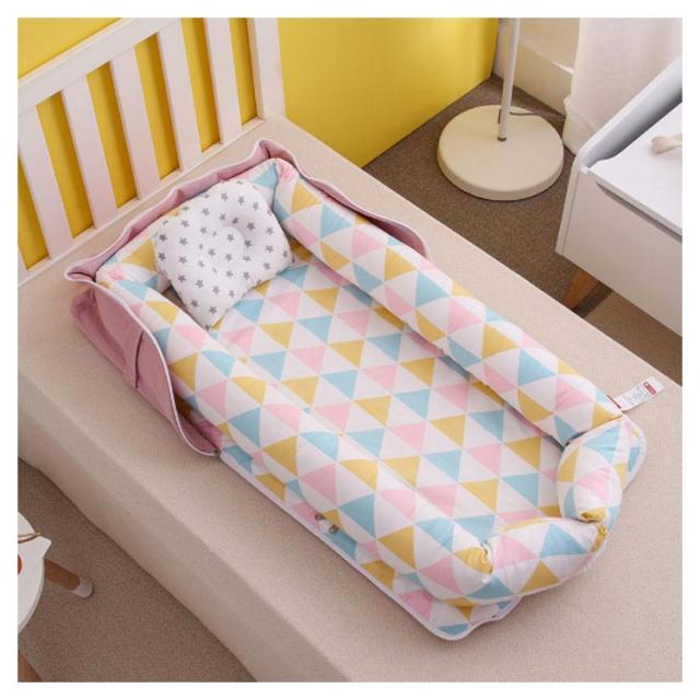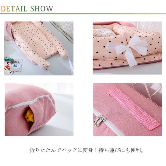 | いろんな場所やシチュエーションで使えるベッドインベッド。 折りたたんでバッグに変身!持ち運びにも便利。 リビング⇔寝室の移動、里帰りや旅行などに最適。 赤ちゃんはストレスなく安心してお休みできます。 カバーを取り外して洗えるのでいつでも安全で居心地が良く、衛生的です。 ベッドでもリビングでも赤ちゃんの安全確保に大活躍しています! | |