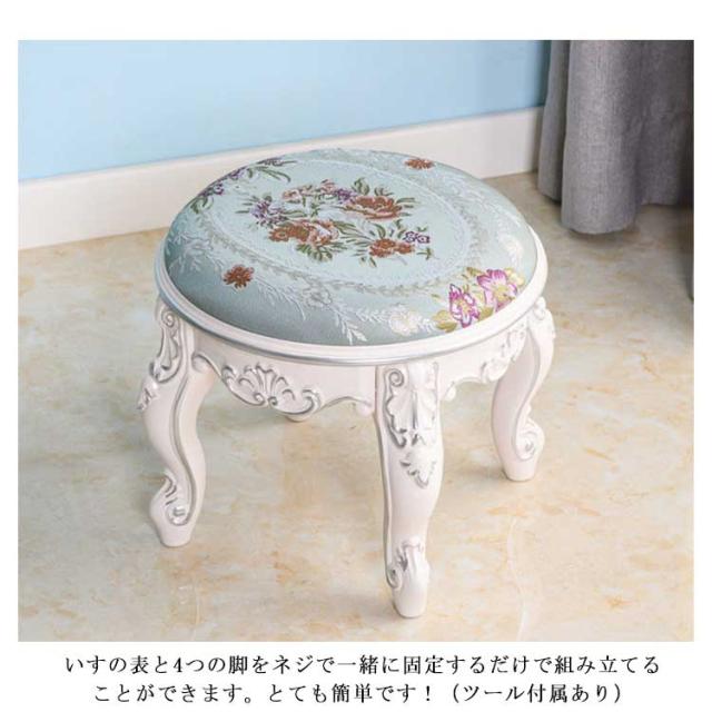 | 女性の方の化粧台の椅子に、玄関のちょっとしたスペースに腰掛ける用の椅子に、またはお子様の教育机の椅子など、用途は様々です! サイズがコンパクトな為移動の持ち運びも簡単! 座面にはクッションが入っているので、すわり心地も良いアイテム。 なんとなくノルディック柄をイメージしてしまう奢華なデザインのスツールです。 円形で角がないので、お子様がいるご家庭でも安心してお使いいただけます。 いすの表と4つの脚をネジで一緒に固定するだけで組み立てることができます。とても簡単です!(ツール付属あり) | |