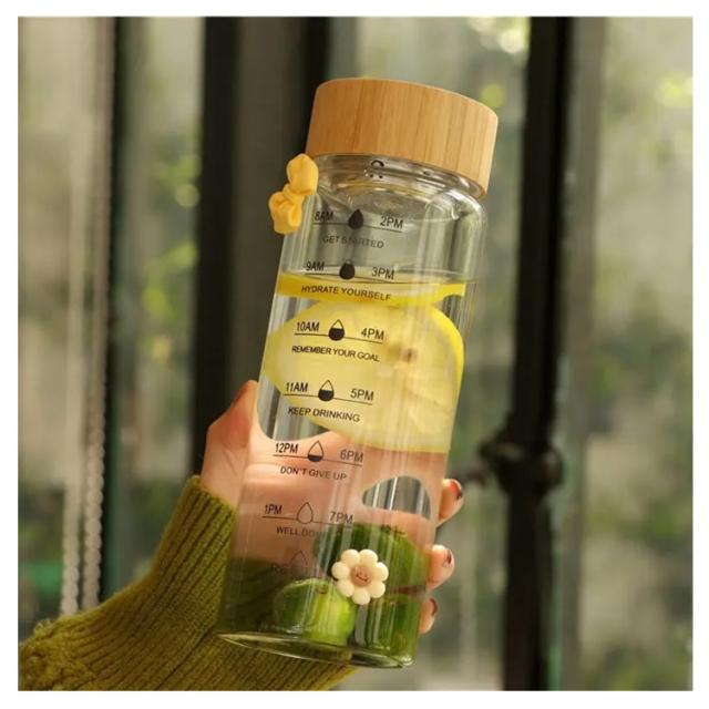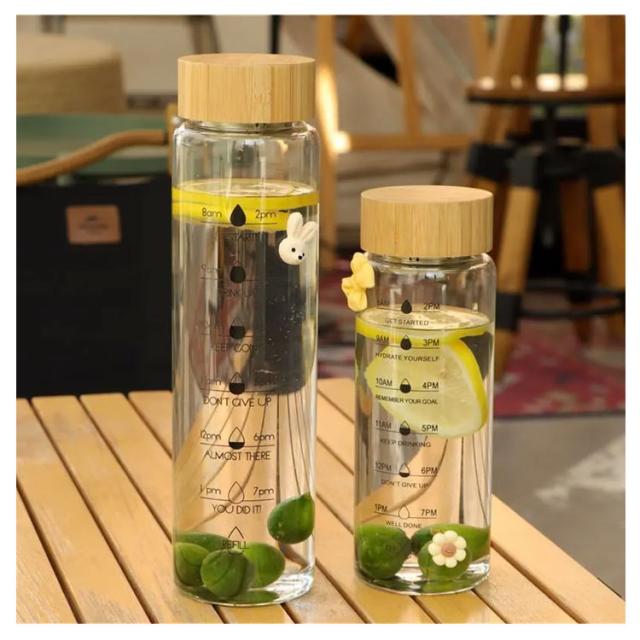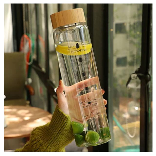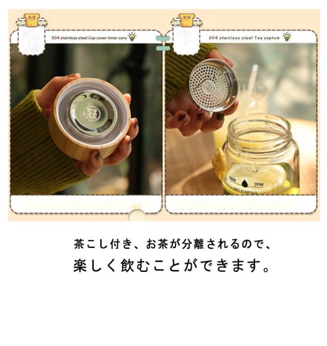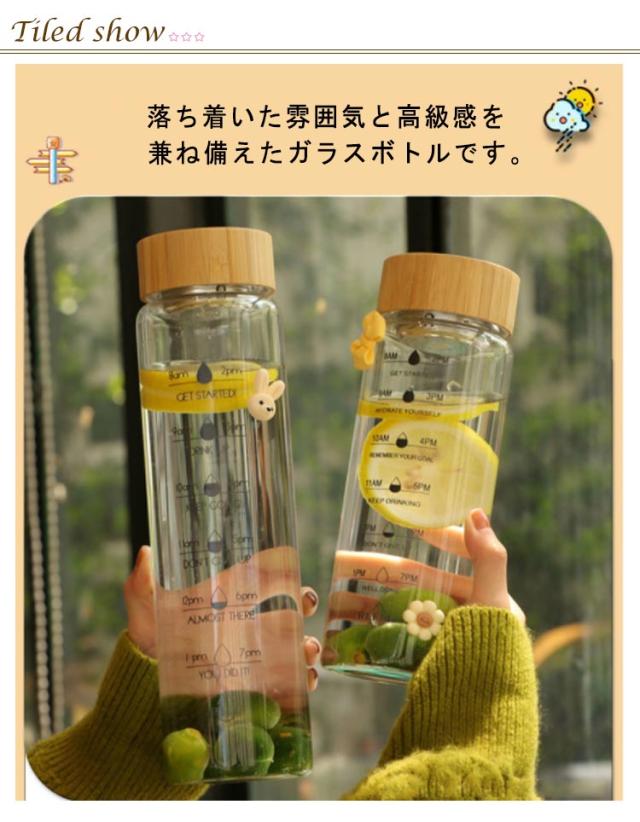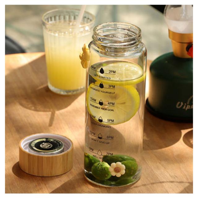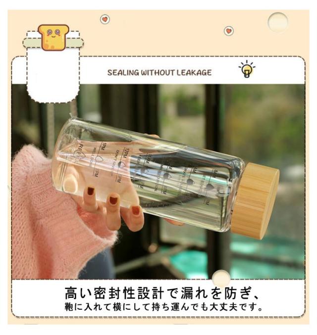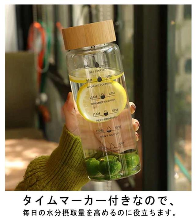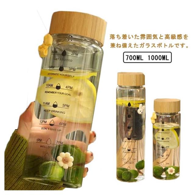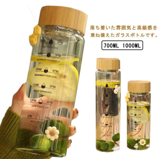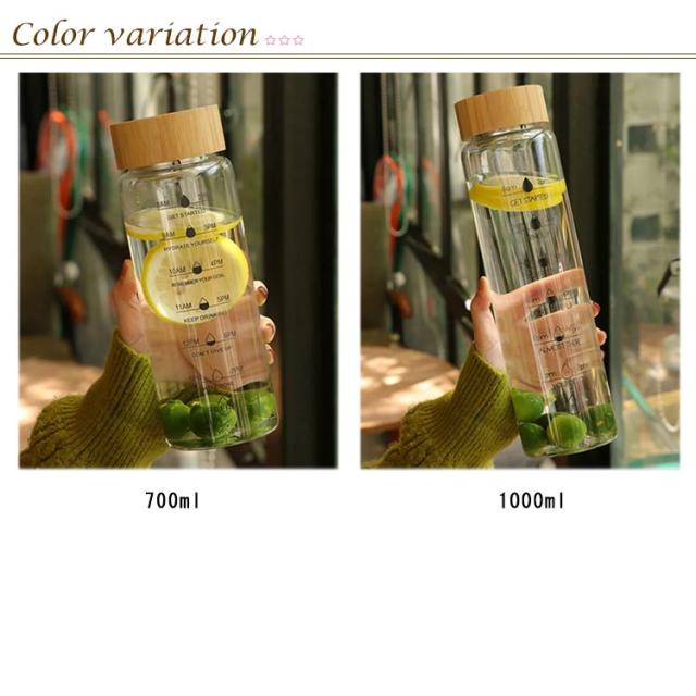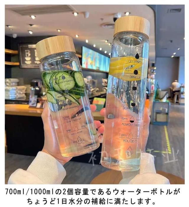 ボトル 水筒 ウォーターボトル 700ml/1000ml 木の蓋 スポーツボトル 時刻マーク ガラス 男女兼用 密封性 直飲み 軽量 耐冷耐熱 茶こし付き オフィス 大容量 送料無料