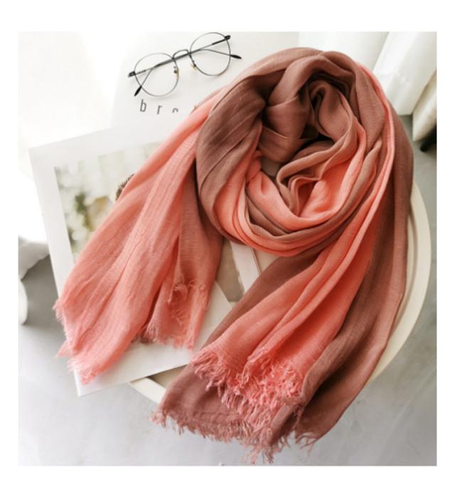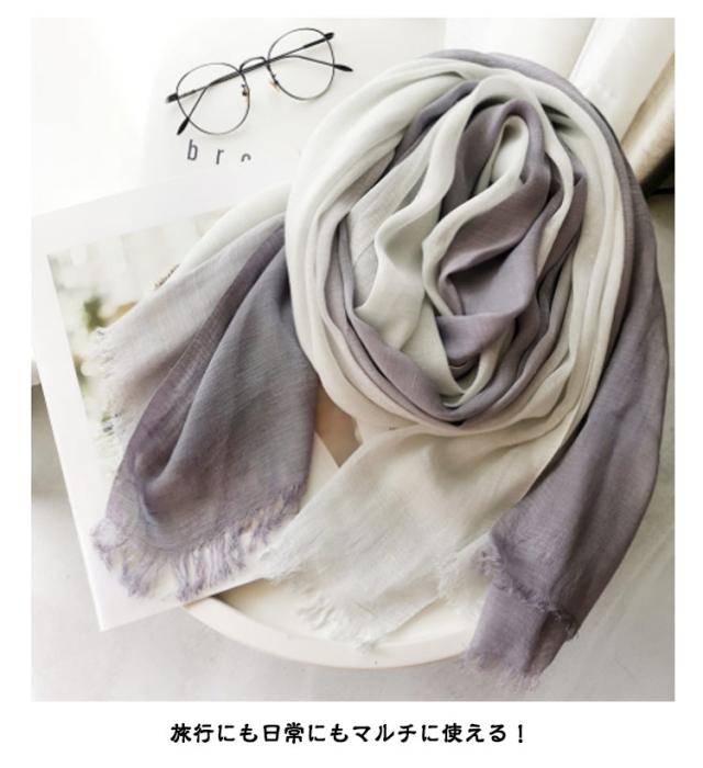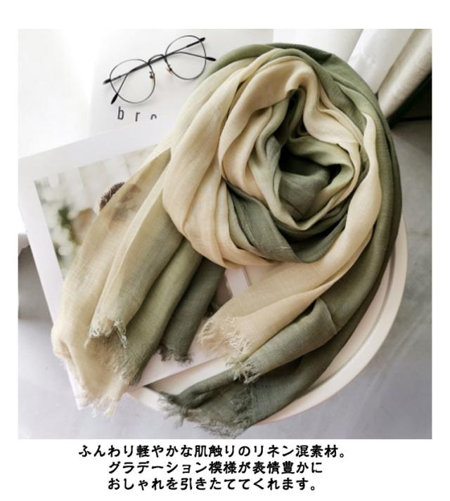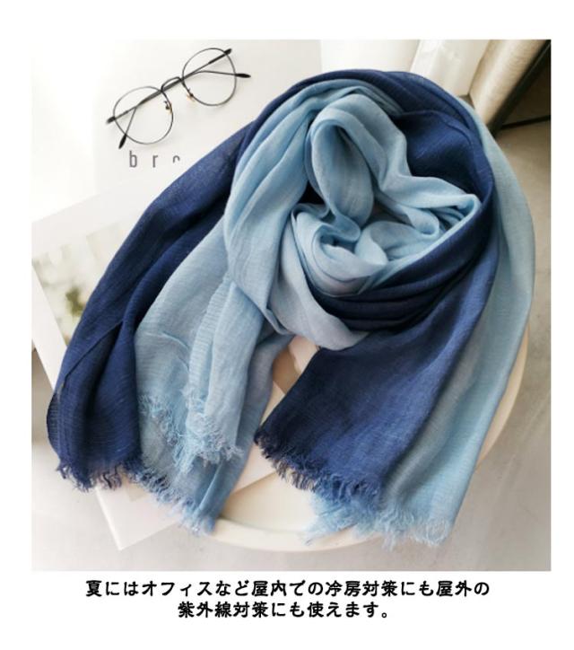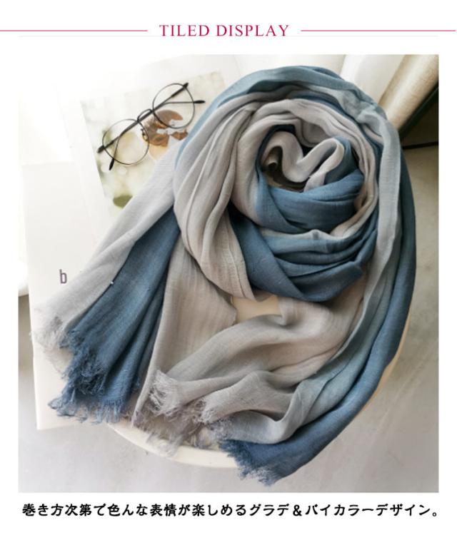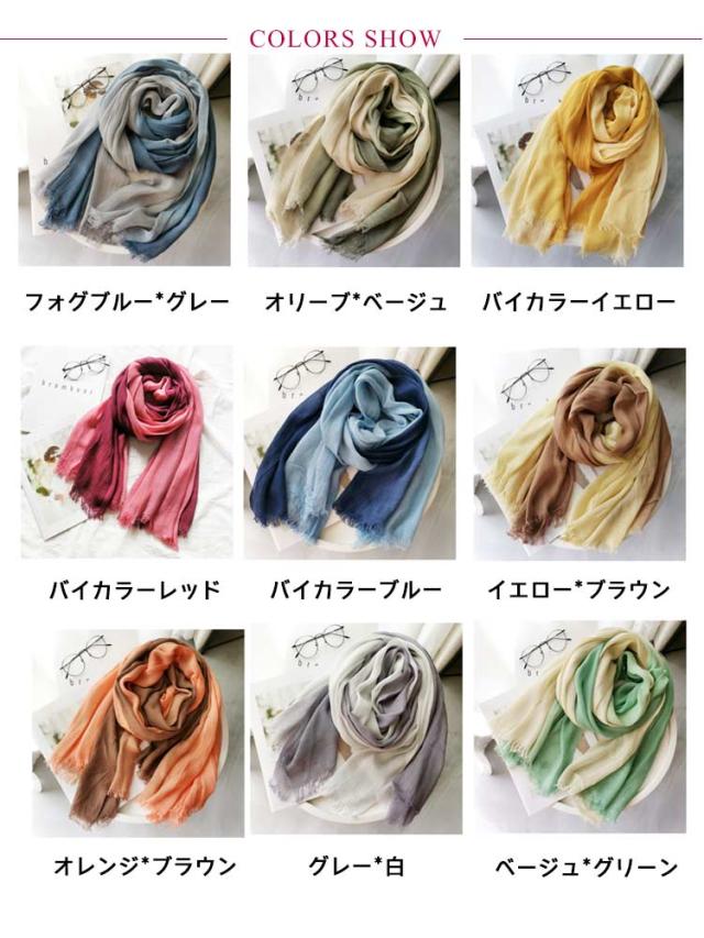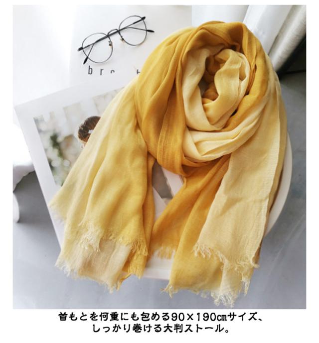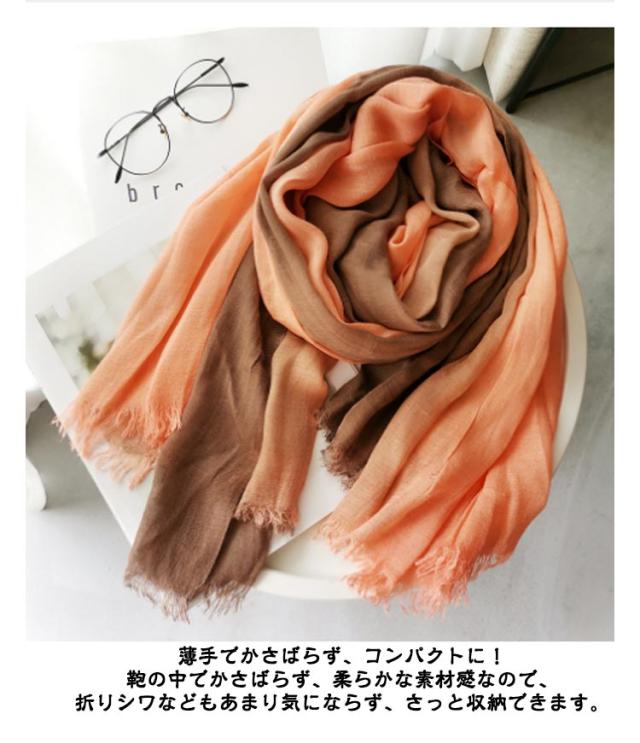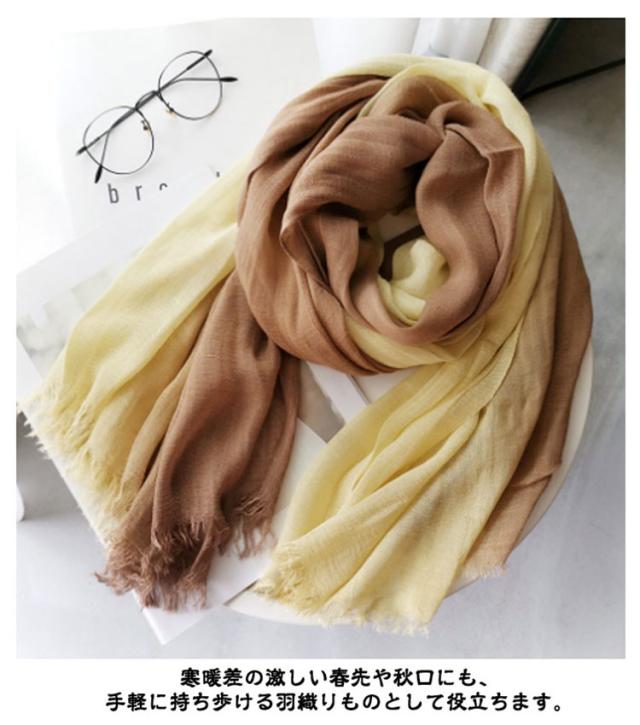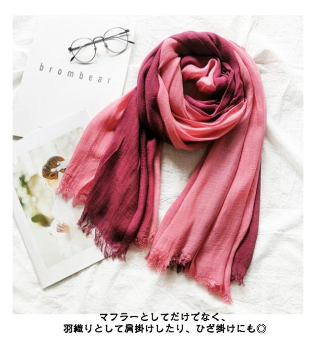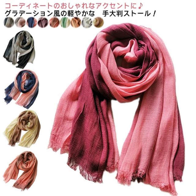 | コーディネートのおしゃれなアクセントに♪グラデーション風の軽やかな薄手大判ストール! 巻き方次第で色んな表情が楽しめるグラデ&バイカラーデザイン。 ふんわり軽やかな肌触りのリネン混素材。 グラデーション模様が表情豊かにおしゃれを引きたててくれます。 首もとを何重にも包める90×190cmサイズ、しっかり巻ける大判ストール。 マフラーとしてだけでなく、羽織りとして肩掛けしたり、ひざ掛けにも◎ 夏にはオフィスなど屋内での冷房対策にも屋外の紫外線対策にも使えます。 寒暖差の激しい春先や秋口にも、手軽に持ち歩ける羽織りものとして役立ちます。 薄手でかさばらず、コンパクトに!鞄の中でかさばらず、柔らかな素材感なので、折りシワなどもあまり気にならず、さっと収納できます。 旅行にも日常にもマルチに使える! | |