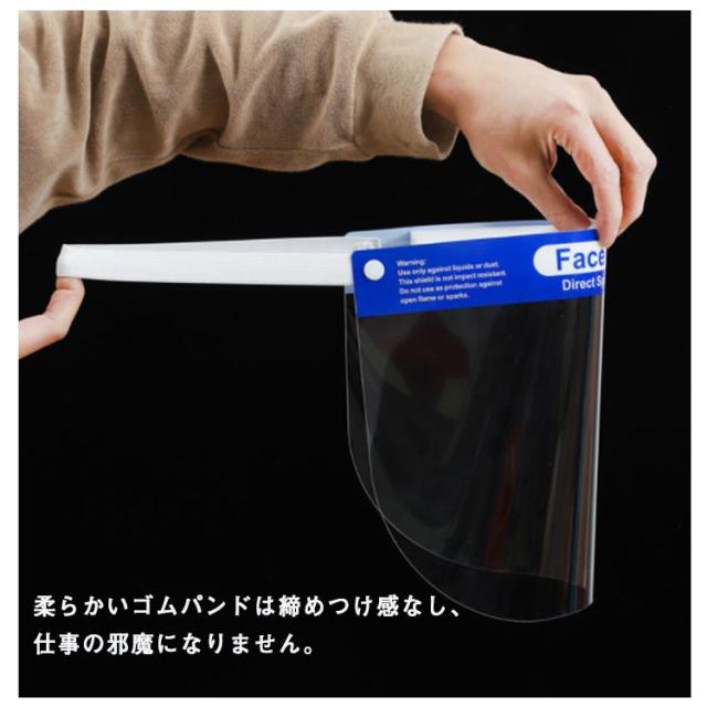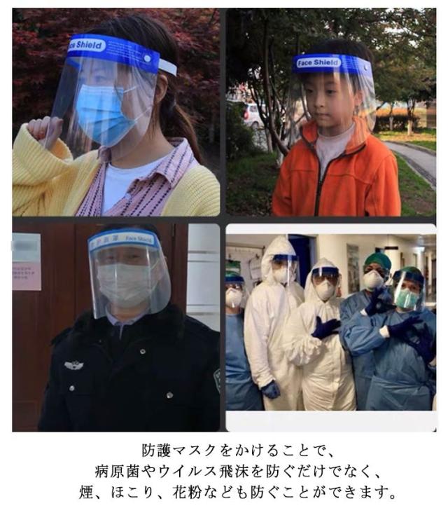 | 花粉症、風邪、ハウスダストなどの対策に使える、フェイスド100枚セット。 軽量で装着が簡単、顔を広範囲に保護してくれるフェイスガードです。 良質なPET素材を採用されており、透明性が良く視界良好!耐衝撃、防水、防霧、長時間の装着でも疲れない軽量タイプです。 柔らかいゴムパンドは締めつけ感なし、仕事の邪魔になりません。 保護カバーは簡単に上下に移動できます。メガネをかけることができます。 顔を保護する、細菌の損害を避けることができます。 防護マスクをかけることで、病原菌やウイルス飛沫を防ぐだけでなく、煙、ほこり、花粉なども防ぐことができます。 粉塵が舞う場所や花粉やホコリの多い場所での作業の人に最適です。 ご使用前に表面を外してください。 | |