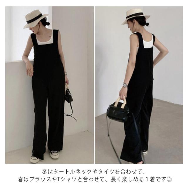 サロペット パンツ オールインワン レディース 春 夏 秋 スクエアネック 大人 ロング丈 ワイド パンツ 落ち感 きれいめ カジュアル 通勤 オフィス かわいい おしゃれ 旅行 ゆったり 大きいサイズ ブラック 【送料無料】