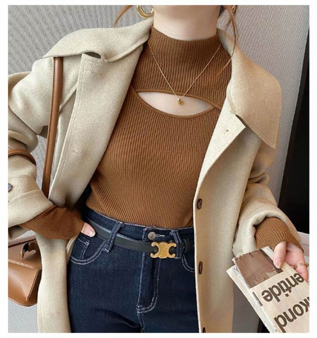 送料無料 フロントオープンニットトップス レディース カットアウト 胸開き タートルネック セーター ニットセーター 長袖 プルオーバー タイト リブニット 胸元 上品 フィット バスト セクシー オフィス カジュアル