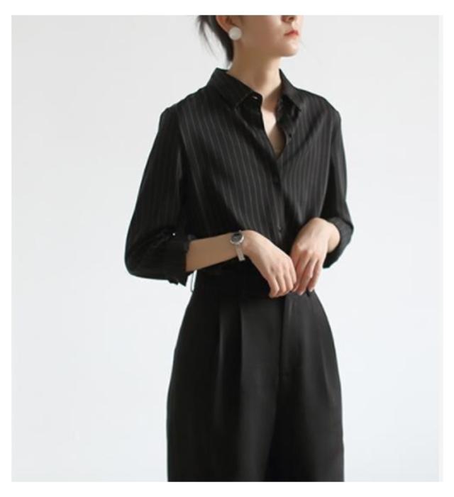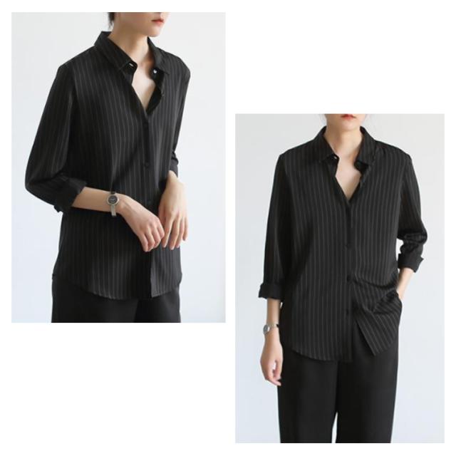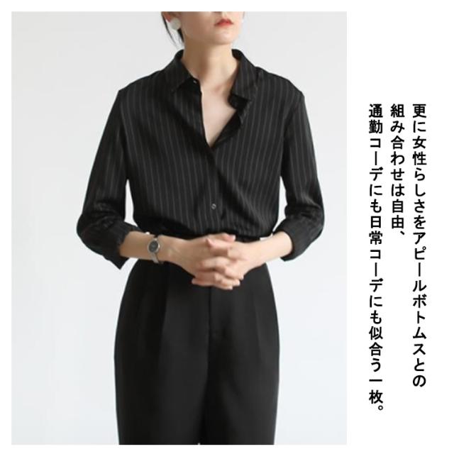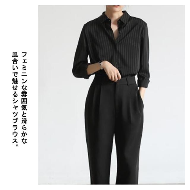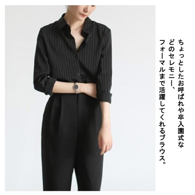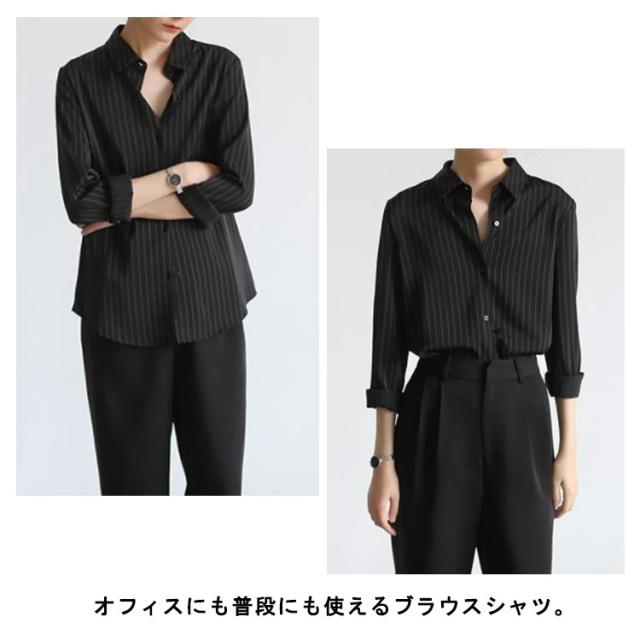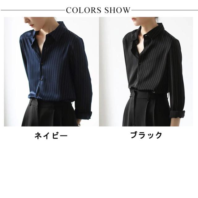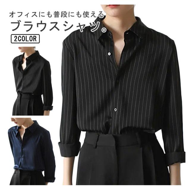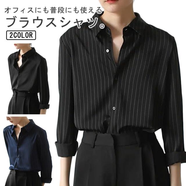 ストライプシャツ レディース 長袖 ブラック ネイビー きれいめ シンプル ブラウスシャツ カジュアル ストライプ シャツ トップス ロングシャツ オフィス 通勤 大人 20代 30代 40代 春秋 ブラウス OL 体型カバー