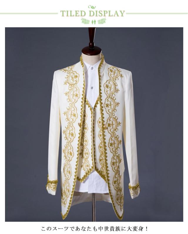 | 中世の貴族や王子様みたいなスーツ3点セット このスーツであなたも中世貴族に大変身! 仮装や写真撮影、舞台ステージ衣装の他に、結婚式や二次会やパーティー、コスプレにおすすめです。 本格派大人用メンズコスプレ衣装をお求めの方に! ゴールドの刺繍風模様が華やかさや高級感をグッとアップさせます! グループでおそろいにして、人気アイドルの楽曲を披露したら きっとイベント会場が盛り上がりますよ! ブラックはゴシックな印象に、ホワイトはさわやかな王子になれます! 本商品はジャケット・ベスト・ズボンの3点セットです。 ワイシャツは付属されておりません。 ホワイト系のセットにお手持ちの白シャツをインしたらあっという間にキラキラ王子様の完成! ブラック系のセットに黒シャツを合わたらゴシック系でカッコよさを叶えます! どちらのカラーにもゴールドの刺繍生地を縫い付けてありますので高級感があり、目立つこと間違いなし! | |