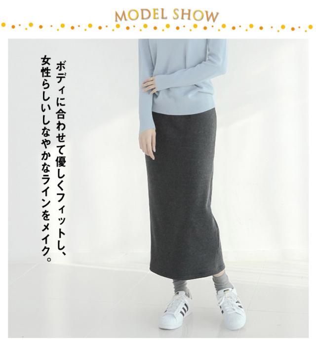 | 毛足の長い肉厚裏起毛タイトスカート♪ しっかり下半身の冷えを守ってくれる厚手ロングスカート、綺麗なシルエットが魅力的。 ボディに合わせて優しくフィットし、女性らしいしなやかなラインをメイク。 タイトでありながらも伸縮性のあるスウェット素材を使用し、バックスリット入りで、窮屈感なく足さばきも楽チン。 無地でシンプルなアイテムなので、20代30代40代50代60代と幅広い年齢の方に着用していただけます。 | |