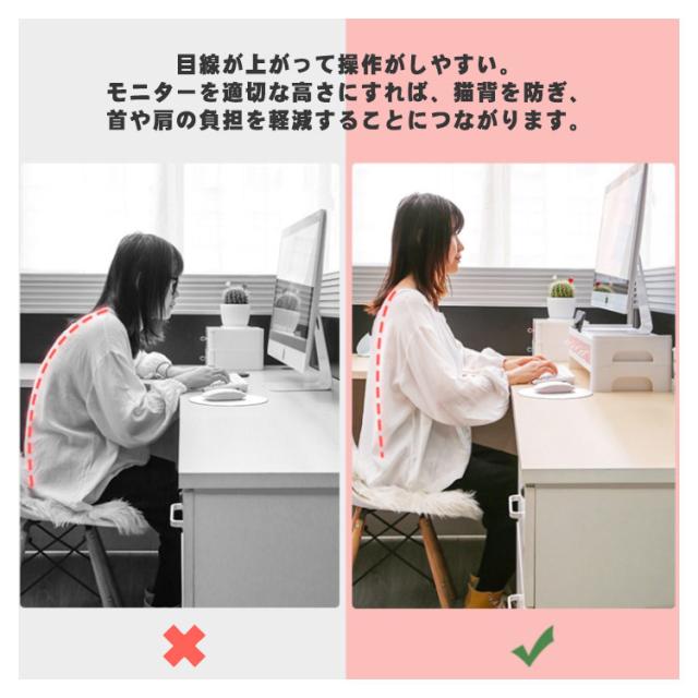 | 高さ変更&収納付きで便利なモニター台。3つの引き出し付きで収納力抜群! 散らかりがちなデスク周りがスッキリ♪収納スペースを作ってデスクが広く使える。 鉢植えなどの飾り物をつけば、特有の癒し空間を作れます。 キーボードやマウスをすっきり収納。作業スペースが広がります。 目線が上がって操作がしやすい。モニターを適切な高さにすれば、猫背を防ぎ、首や肩の負担を軽減することにつながります。 段数変更と引き出しの取り外しでシーンに合わせて使い分けられます。 おしゃれな4カラーをご用意しました。 | |