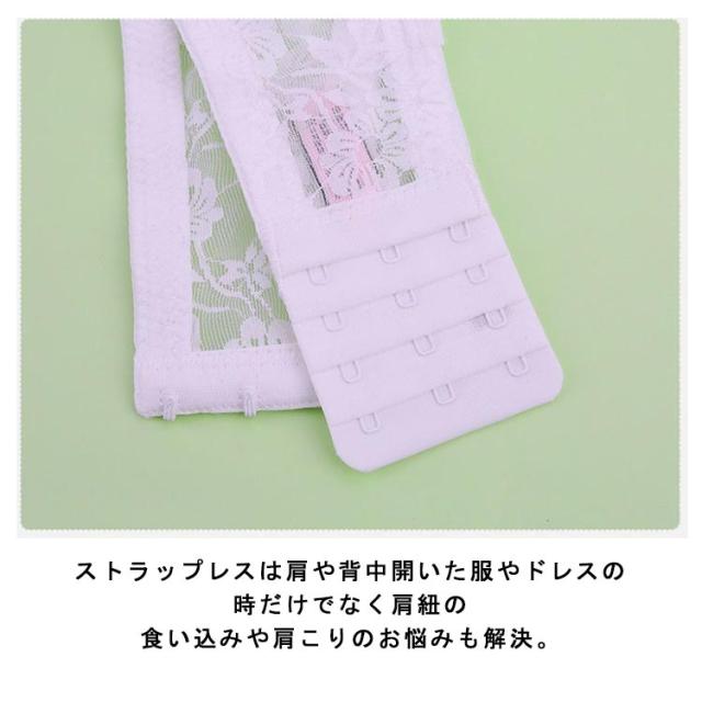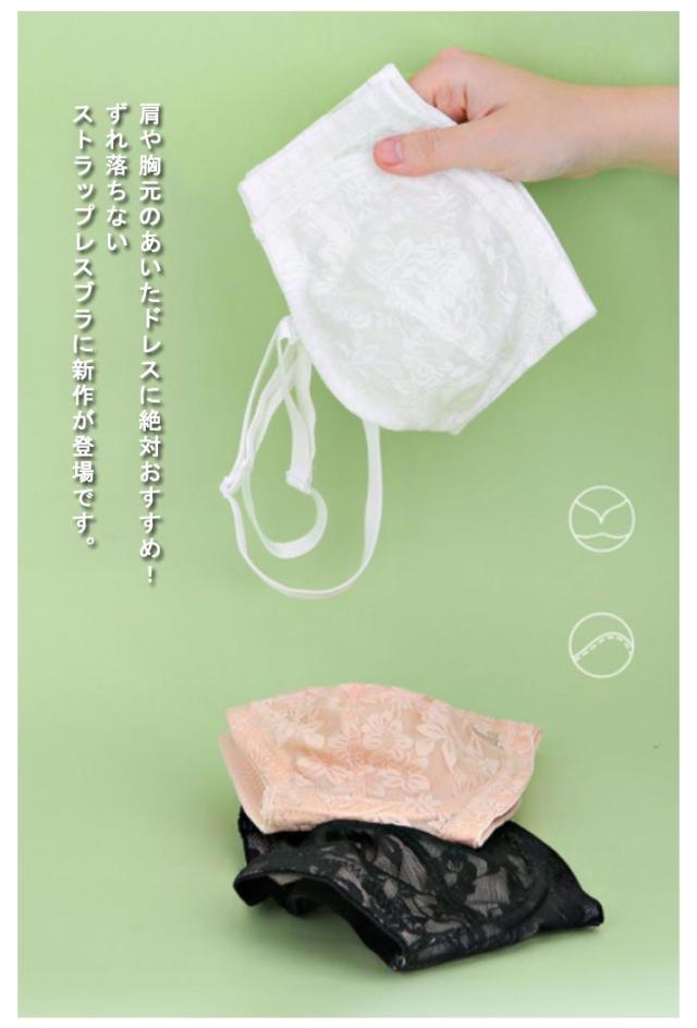 | 肩や胸元のあいたドレスに絶対おすすめ! ずれ落ちないストラップレスブラに新作が登場です。 かわいいレースデザイン、胸を小さく見えるストラップレスブラ。 薄手レース素材を使用、綺麗なシルエットにカップ部分は柔らか素材で通気性があり汗ばむ季節も快適。 ストラップレスは肩や背中開いた服やドレスの時だけでなく肩紐の食い込みや肩こりのお悩みも解決。 オフショルダー、キャミソール、どんな装いにも合わせやすく、幅広いシーンで大活躍するストラップレスブラジャー。 ストラップ付きなので、普通のブラジャーにも変身可能! オンにもオフにも使える万能ブラです。 | |