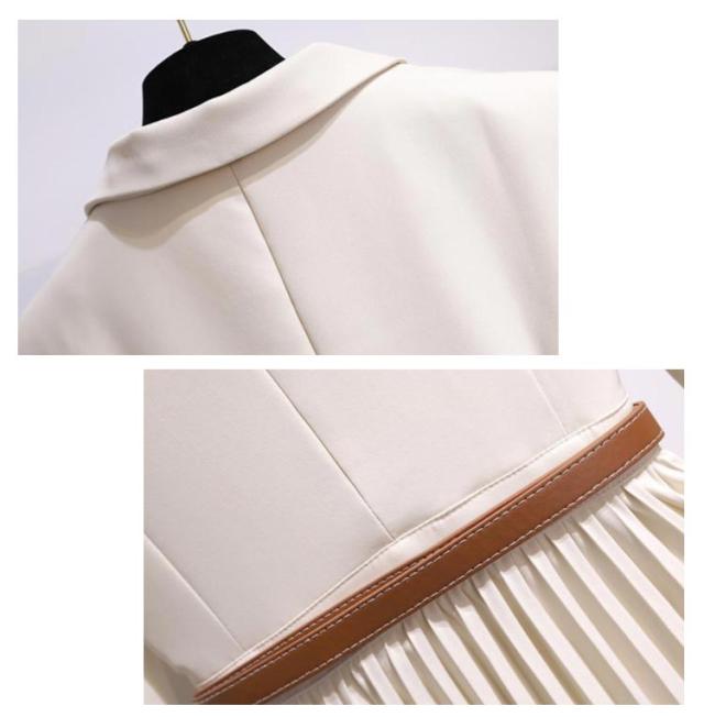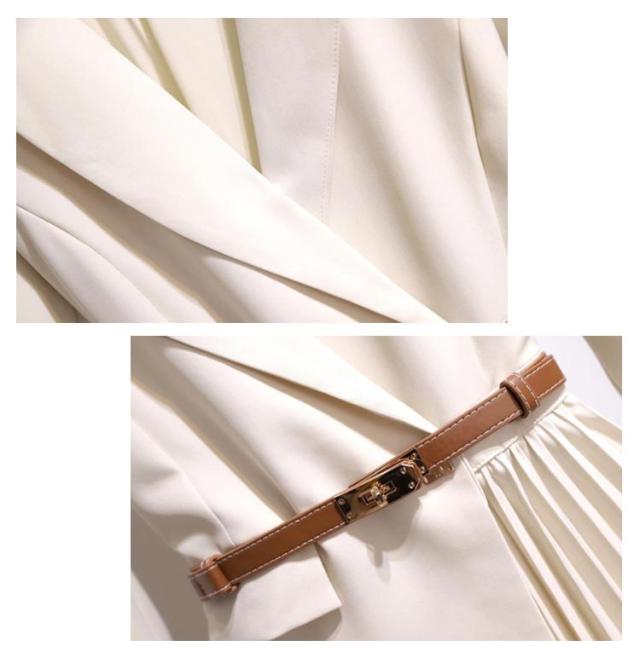 | ジャケットとプリーツスカートをドッキングさせた新鮮なデザインのワンピース。 ふわりと揺れるプリーツスカートがエレガントな印象に 長めの着丈なのでフォーマルなシーンにもぴったりのアイテムです。 1枚で上品な着こなしが完成し、セレモニーから通勤まで幅広いシーンにお勧めです。 合皮ベルトでウェストマークが可能です。 動きやすく、しっとりとした手触りが特徴の生地を使用しています。 | |