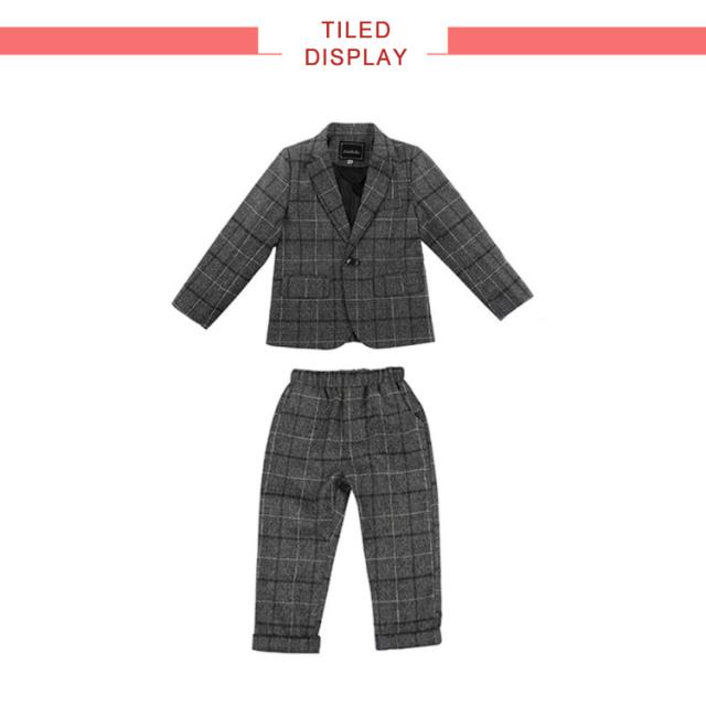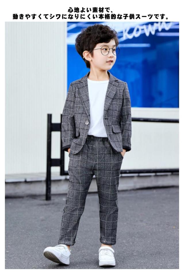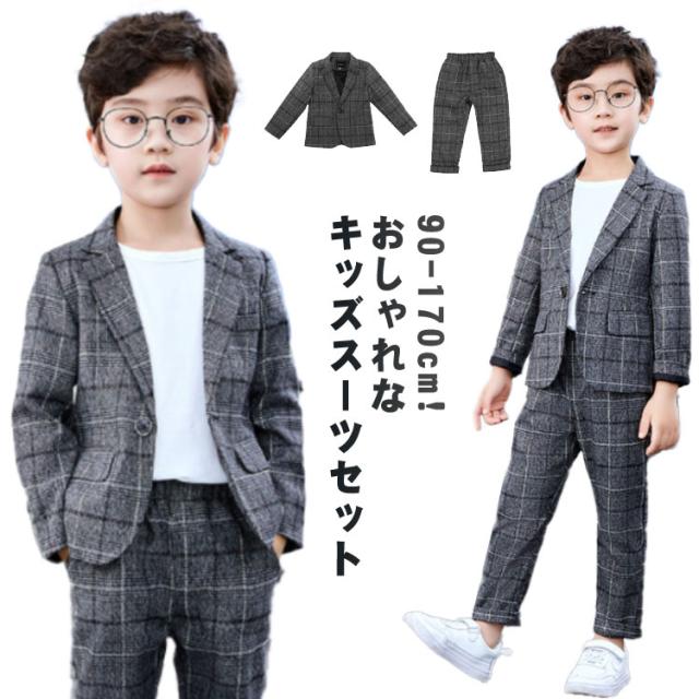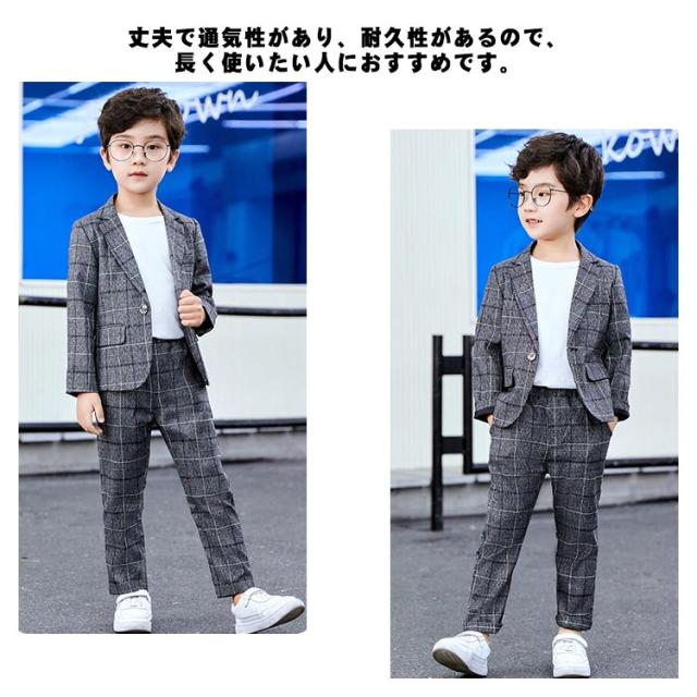 卒業式 スーツ 男の子 子供服 キッズ 入学式 スーツ フォーマル ジュニアスーツ フォーマルスーツ 卒業式 発表会 七五三 パーティー お祝い スーツ 小学生 低学年 高学年 チェック 長袖 ジャケット ロング パンツ 上下 2点セット ウエストゴム 送料無料 グレー 90-170cm
