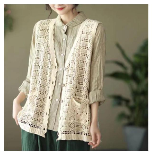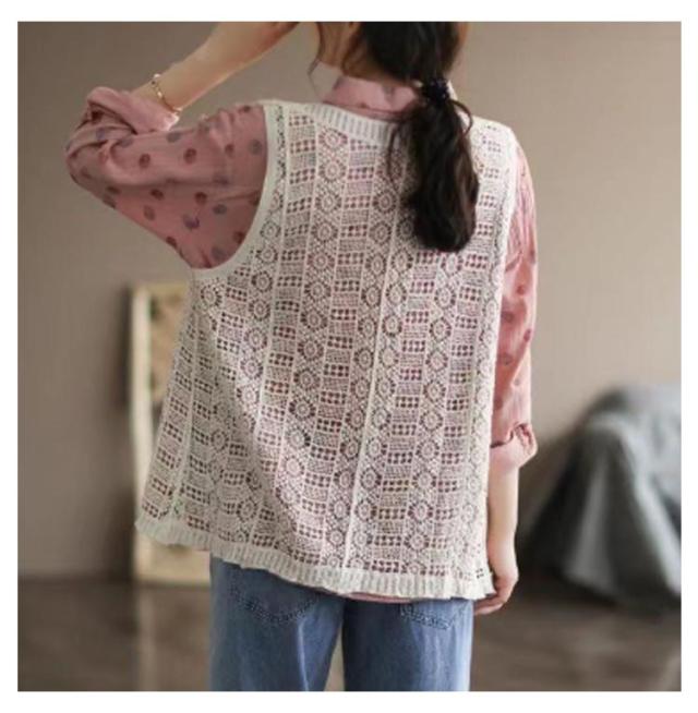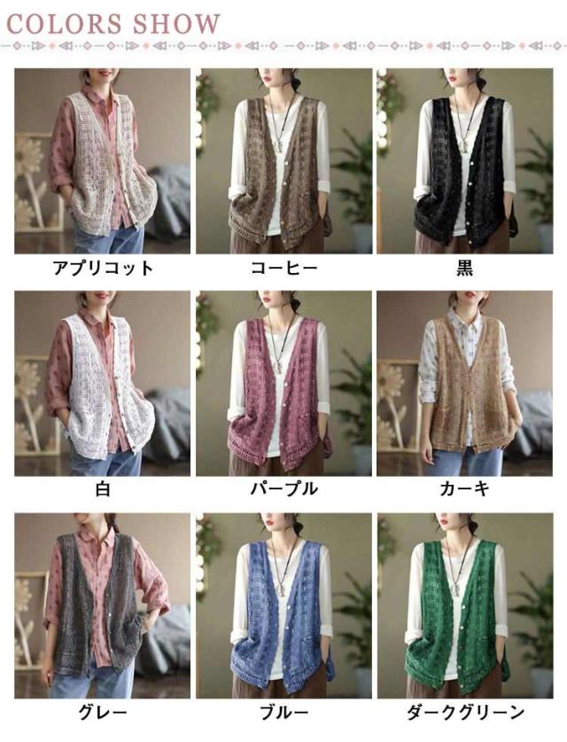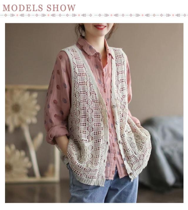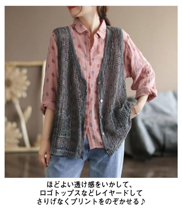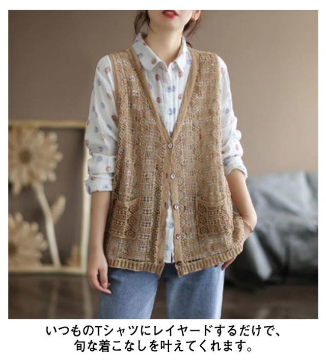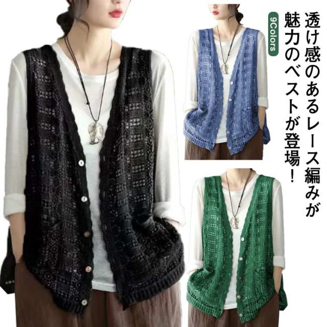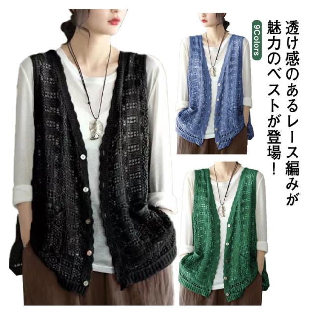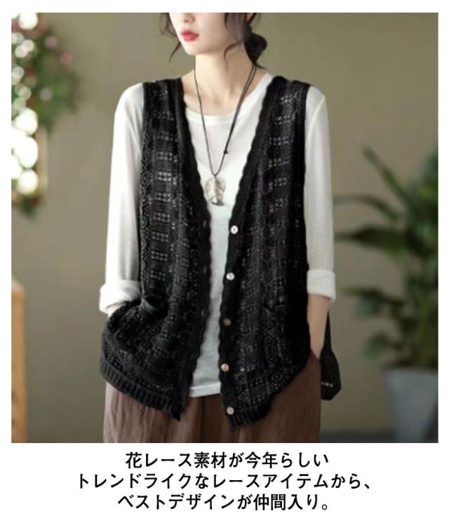 送料無料 ベスト ジレ レディース おしゃれ ニットベスト 前開き トップス 春夏 ショート丈 前開き カーディガン アウター 花柄 春ベスト 透かし編み 総柄 レース ニット編み ノースリーブ 洒落 重ね着 レイヤード風 通勤 大人 可愛い