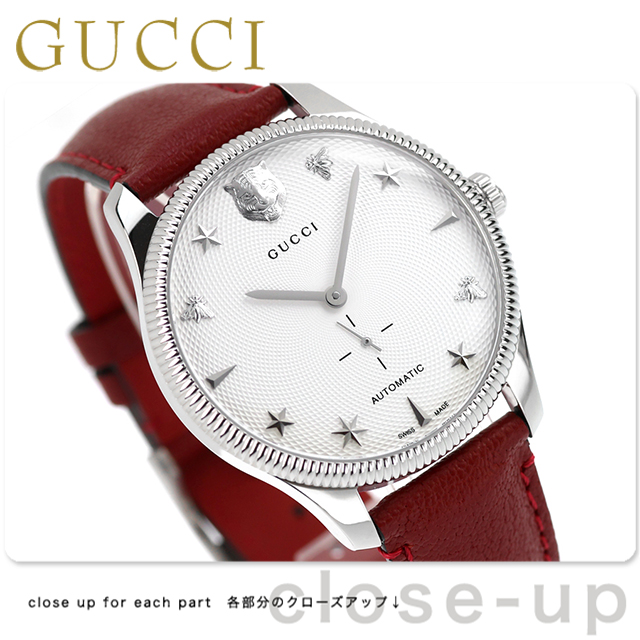 7年保証キャンペーン Gタイムレス 虎 蜂 星 スイス製 メンズ 腕時計 YA126346 アナログ シルバー レッド 赤 ◆1921年、グッチオ・グッチは革製品の会社を起業し、フィレンツェに小さな鞄店を開業。ブランドに対する彼のビジョンは、ロンドンと、彼がサボイ・ホテルで働いていた時に見た英国貴族の洗練された審美眼から培われたものです。財布や革製品以外にもアクセサリーや腕時計も品質の高さや、洗練されたデザインが人気で一気に高級ブランドの地位を確立しました。今では名を知らない人はいないぐらい世界的に有名なブランドです。 タイガーやグッチビーなどのアイコンをインデックスにあしらった腕時計。大きめのラウンドフェイスで、視認性を高めました。ユニセックスで使用できるデザインです。 機械式腕時計