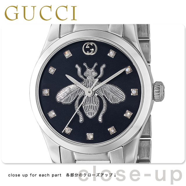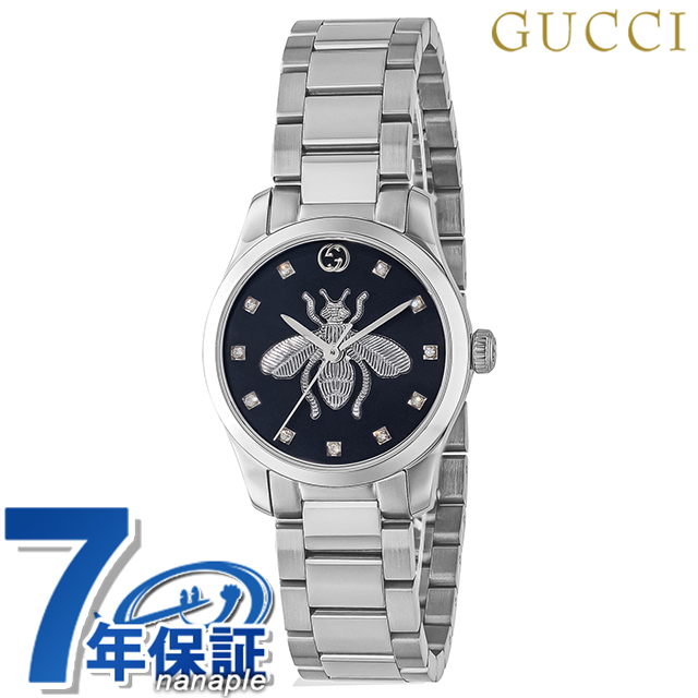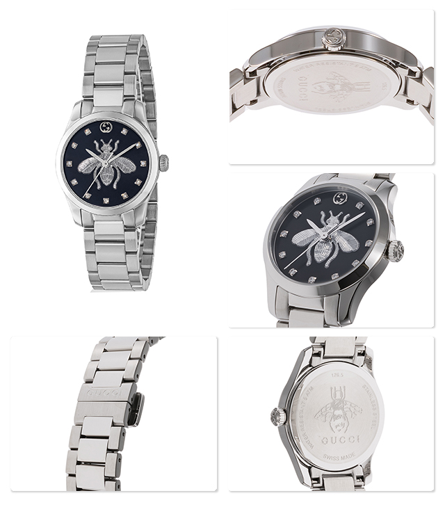 7年保証キャンペーン Gタイムレス 蜂 スイス製 レディース 腕時計 YA1265024 アナログ ブラック 黒 ◆1921年、グッチオ・グッチは革製品の会社を起業し、フィレンツェに小さな鞄店を開業。ブランドに対する彼のビジョンは、ロンドンと、彼がサボイ・ホテルで働いていた時に見た英国貴族の洗練された審美眼から培われたものです。財布や革製品以外にもアクセサリーや腕時計も品質の高さや、洗練されたデザインが人気で一気に高級ブランドの地位を確立しました。今では名を知らない人はいないぐらい世界的に有名なブランドです。 時代に左右されないクラシカルでスタイリッシュなデザインが特徴のGタイムレスシリーズ。文字盤にデザインされた蜂が特徴のモデル。シンプルなストーンのインデックスが配置されています。プレゼントにもおすすめです。