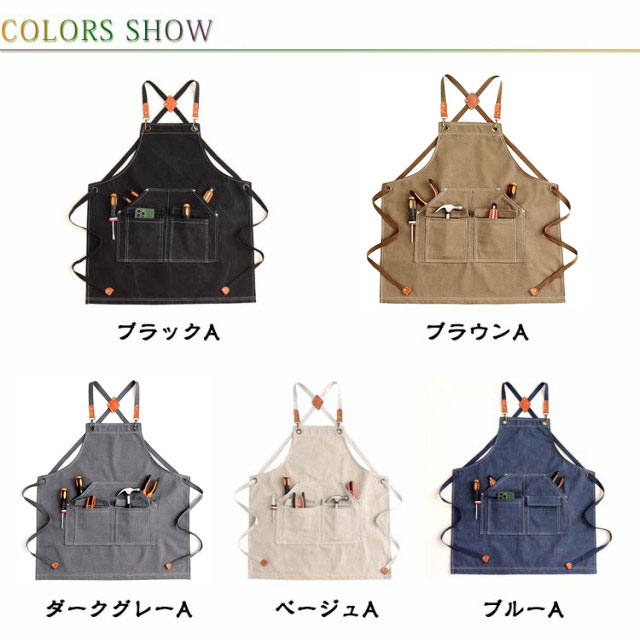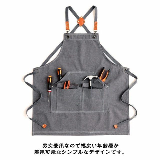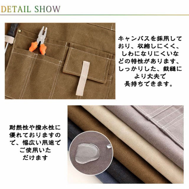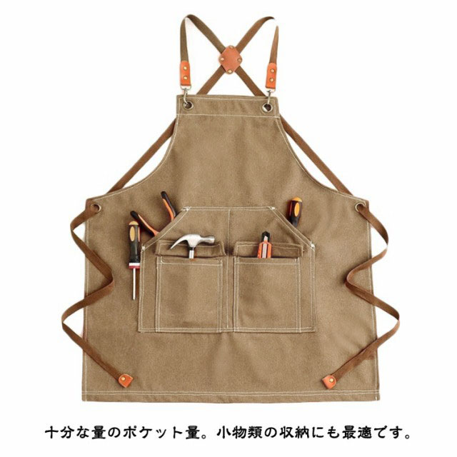 | シンプルに作業用としてお使いいただく事も、アウトドアシーンで料理に使うエプロン キャンバスを採用しており、収縮しにくく、しわになりにくいなどの特性があります、しっかりした、裁縫により丈夫で長持ちできます。 耐熱性や撥水性に優れておりますので、幅広い用途でご使用いただけます エプロンの長さは紐で調節可能です。 十分な量のポケット量。小物類の収納にも最適です。 男女兼用なので幅広い年齢層が着用可能なシンプルなデザインです。 仕事、園芸、BBQ、キャンプ、木工、家事ガレージ、 絵画、清潔、庭師、スキーショップ、大工など、 作業服として日常生活にも仕事にも幅広く使われています | |