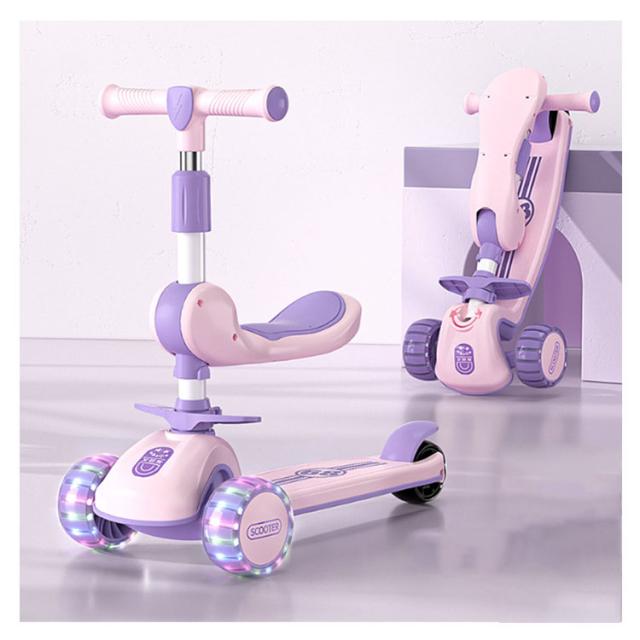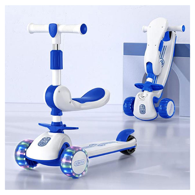 | 【子供用キックボード】【取り外し可能サドル付き】【折り畳み】【選べる4色】 幅広い光るタイヤが特徴の折りたたみ式三輪キックボード。 大きめのタイヤを採用することで安定性を高めたキックボードで倒れ防止し、各種道路に適用。 高さ調整も82/75/68/63cmと四段階調整が可能で、お子様の成長に合わせて調整が可能です。 方向転換はハンドルを左右に傾けると、タイヤが自動的に方向を変え、ブレーキにはフットブレーキを採用。 使用しないときはコンパクトに折りたたむことが可能。 折りたたみ方法: ハンドルを上に引き出して、踏み台に折りたたみました。 (ご注意:公道での走行は大変危険ですので絶対におやめください。) | |