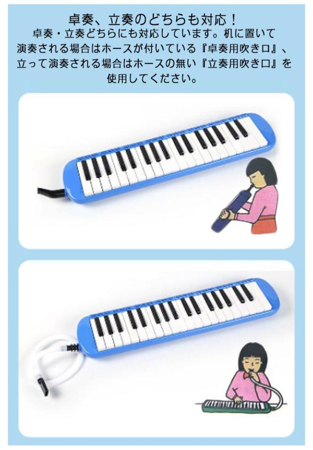 | 32鍵盤!鍵盤ハーモニカ。音楽の授業で使える! 小学校、幼稚園の音楽の授業で使える!音域を全てカバーした32鍵盤の鍵盤ハーモニカです。 卓奏、立奏のどちらも対応!卓奏・立奏どちらにも対応しています。机に置いて演奏される場合はホースが付いている『卓奏用吹きロ』、立って演奏される場合はホースの無い『立奏用吹き口』を使用してください。 持ち運びに便利な収納バッグ。 保育園、幼稚園はもちろん、小学校における音楽の授業で使っていただける人気の32鍵盤ハーモニカ。 | |