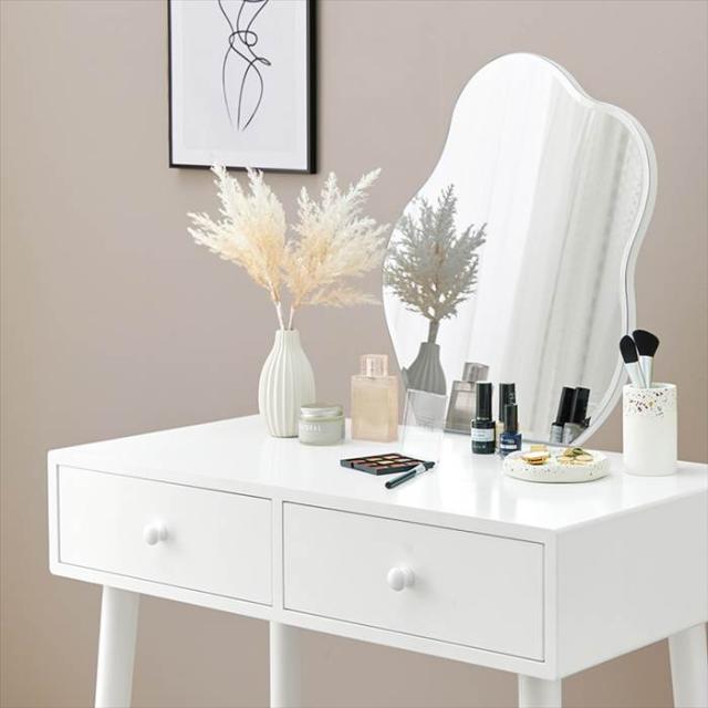 ドレッサー 白 かわいい 通販 MD-6737WH 一面鏡ドレッサー ミラー 1面ドレッサー 鏡台 化粧台 椅子付き コンパクト ウェーブミラー 可愛い おしゃれ シンプル 幅75×奥行48×高さ123.5cm スツール 高さ45cm 収納家具 インテリア