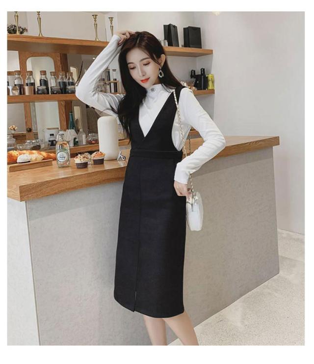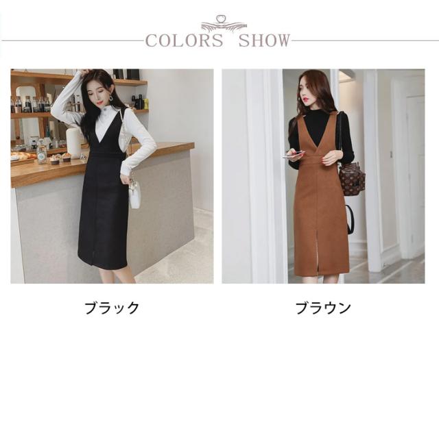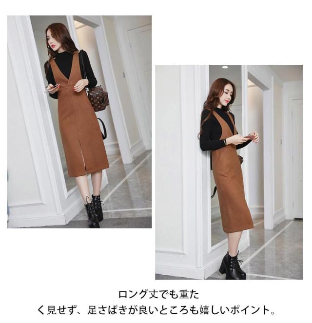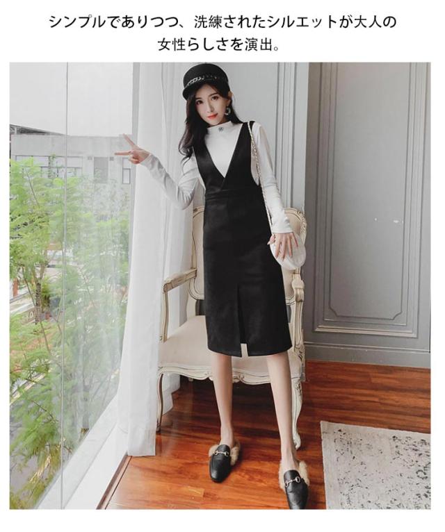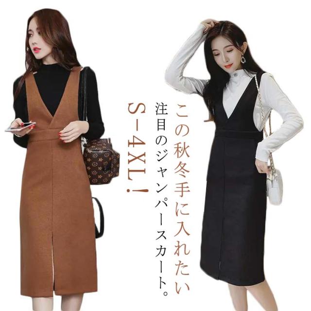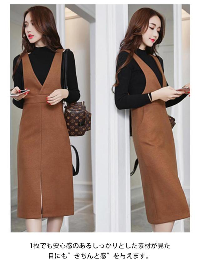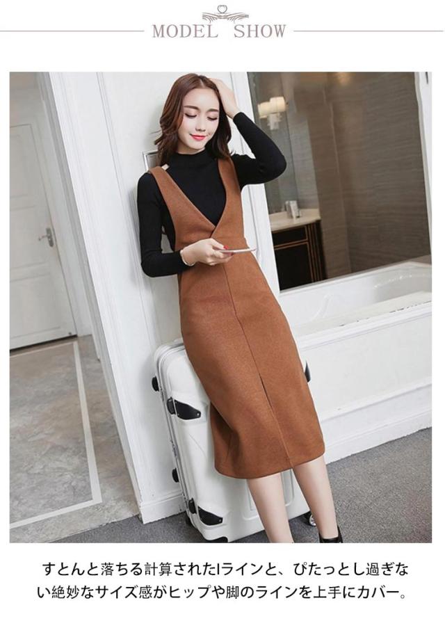 送料無料 ジャンパースカート ワンピース ロングスカート Vネック サロペットワンピース 膝下丈 ジャンスカ ロング 秋冬 無地 着痩せ スカート フロントスリット キレイめ 通勤 エレガント 30代 40代