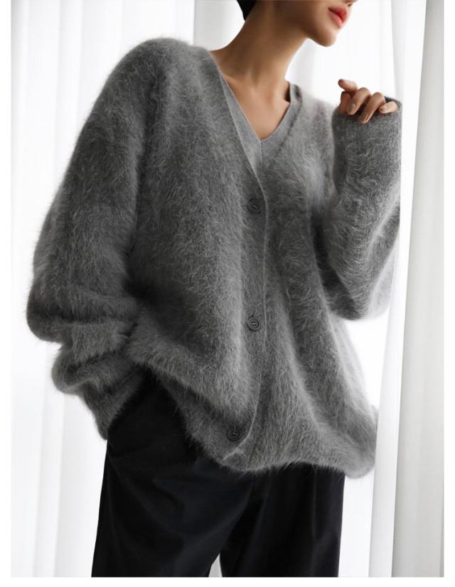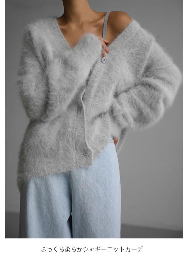 | 新作!カーディガン秋冬定番・シャギーカーディガン ふわふわで滑らかな肌触りのシャギー素材が魅力のVネックカーディガン 気持ちもコーデも心地よく、着るだけで季節感が高まる1着 ボリューム感がありながらVネックなので首回りはすっきり 一枚ですぐに今っぽコーデが完成する、お洒落見せ確実な一枚 季節を纏う、素材楽しむ1着 ふっくら柔らかシャギーニットカーデ | |