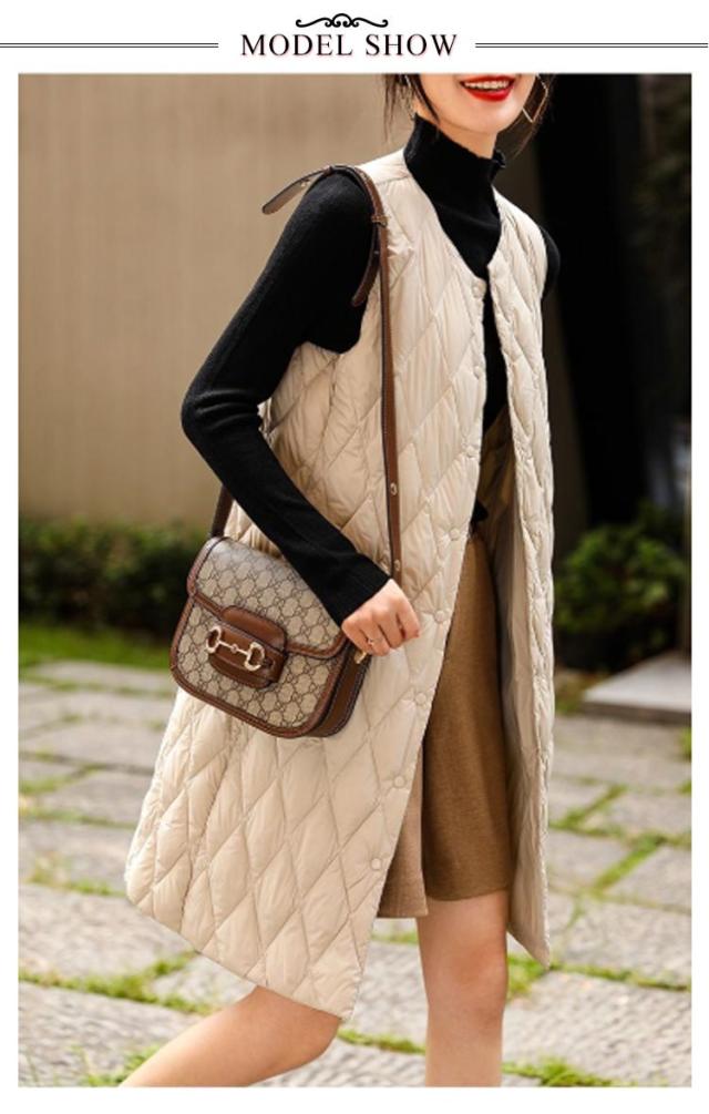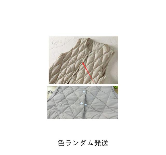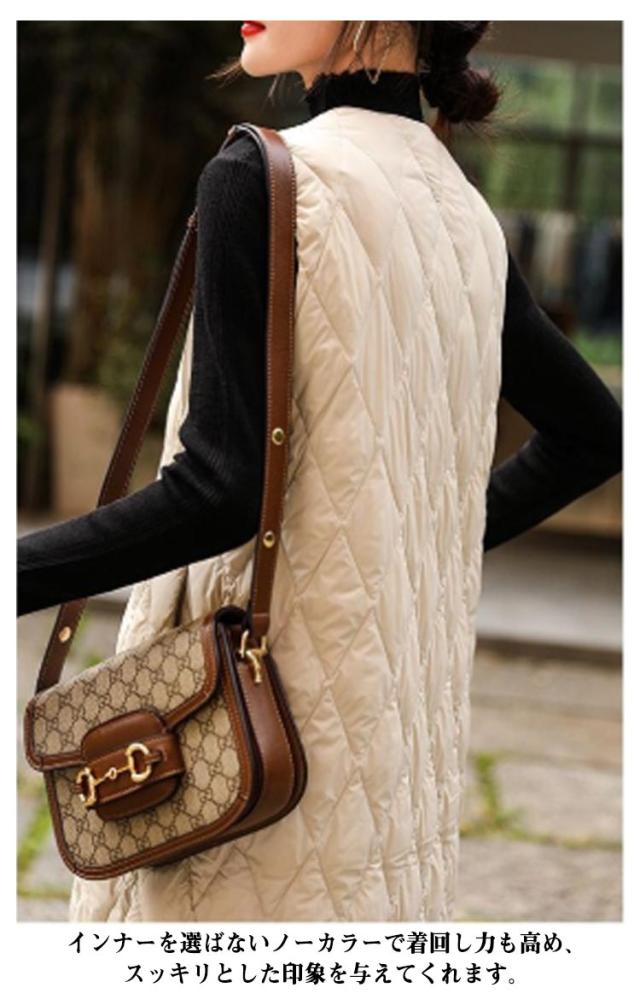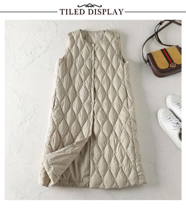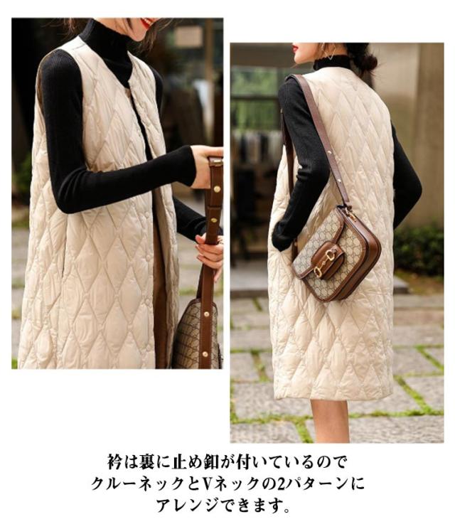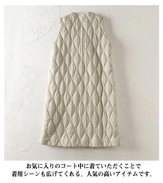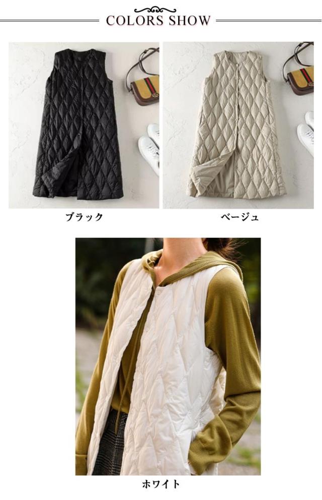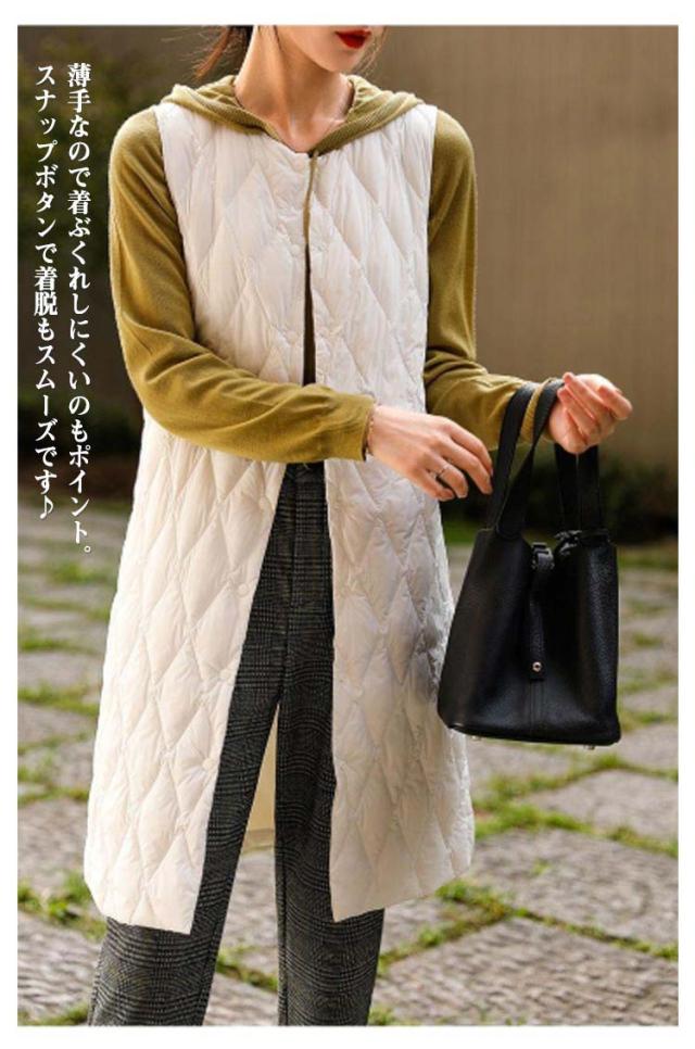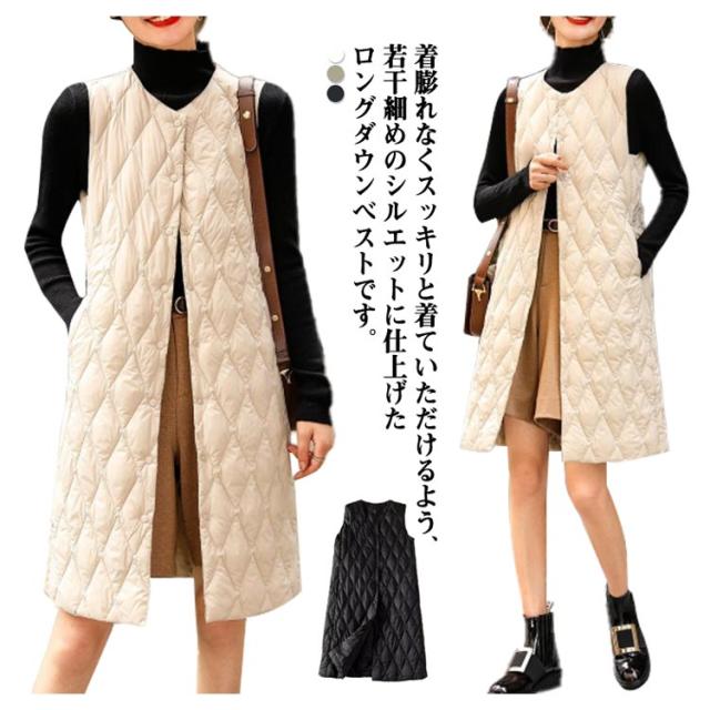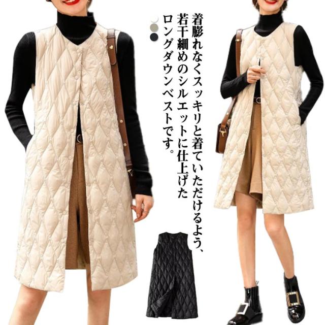 ロングダウンベスト インナーダウン ロングベスト レディース ミセスファッション アウター ライトダウン 軽い 襟なし 体型カバー 暖かい 丈長め キルティングベスト キルトベスト 秋冬 あたっか 薄手 軽量 中綿ベスト 保温 重ね着