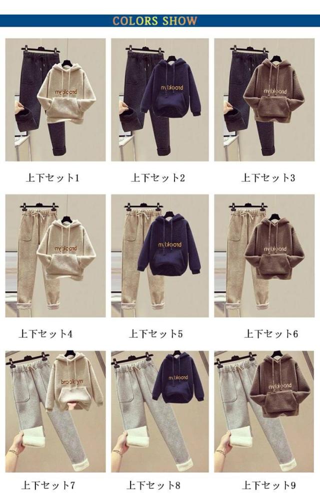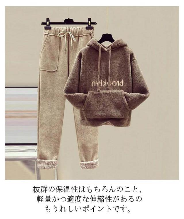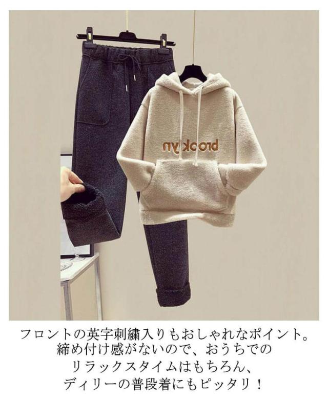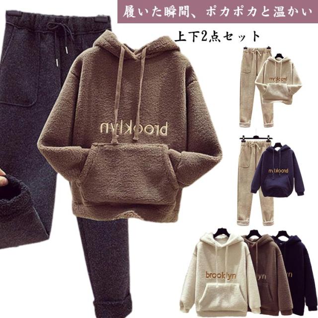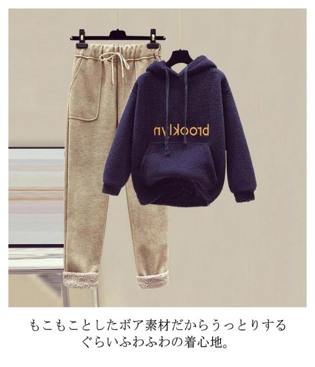 もこもこ パーカー レディース セットアップ 上下セット 裏起毛 イージーパンツ プルオーバーパーカー ボアパーカー あったか 秋冬 部屋着 ルームウエア 英字刺繍 カジュアル おしゃれ 秋 冬 大きサイズ ゆったり 体型カバー プレゼント ギフト 送料無料