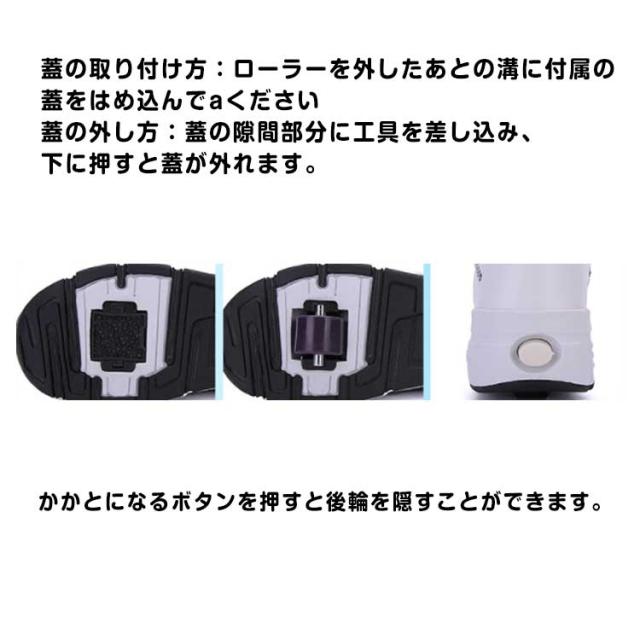 | 強力な支持力、耐衝撃性、より安全で快適な滑走。 かかとになるボタンを押すと後輪を隠すことができます。 大人気のジュニアローラーシューズです。 安定した滑りが可能で色々なテクニックがやりやすくなっています。 フロントローラーは取り外しができるタイプで、付属の蓋をハメればスニーカーとしても使えます! ローラーの取り外し方: 靴をしっかりと押さえて側面を両親指で押しながら持ち上げながら車軸を外してください。 ローラーの付け方:ローラーの車軸をかかとの溝に合わせて、カチッと音が鳴るまで押し入れてください。 蓋の取り付け方:ローラーを外したあとの溝に付属の蓋をはめ込んでください 蓋の外し方:蓋の隙間部分に工具を差し込み、下に押すと蓋が外れます。 | |