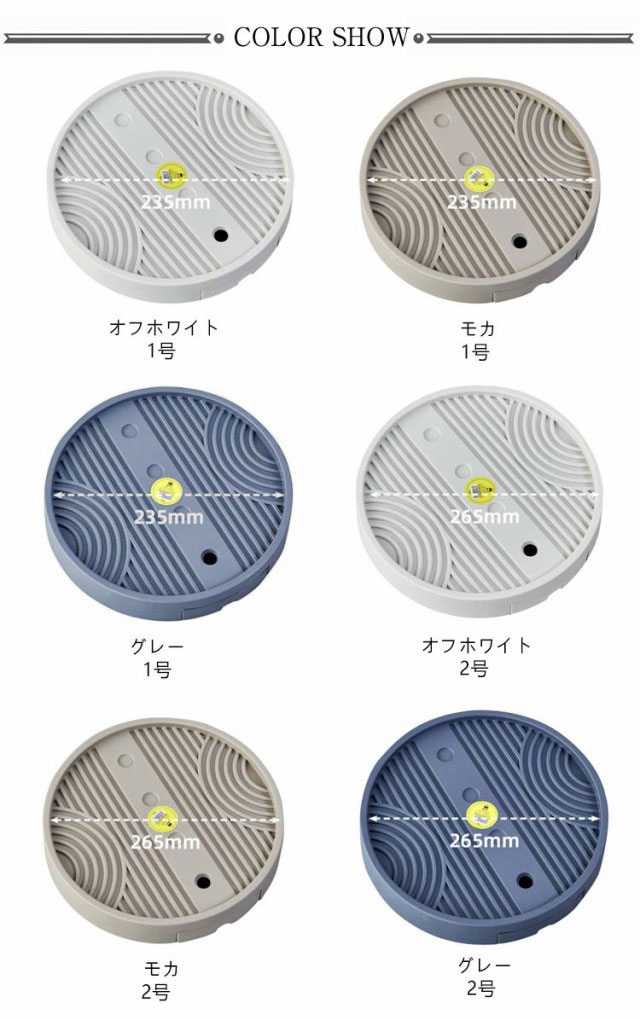 | サイズについての説明 | 【サイズ】 【1号】 内径235mm 外径255mm キャスター4個 高さ50mm 【2号】 内径265mm 外径285mm キャスター4個 高さ50mm 【3号】 内径295mm 外径315mm キャスター4個 高さ50mm 【4号】 内径325mm 外径345mm キャスター4個 高さ50mm 【5号】 内径355mm 外径375mm キャスター4個 高さ50mm ※上記サイズは平置き実寸になります。 サイズ表の実寸法は商品によって1-3cm程度の誤差がある場合がございます。 |