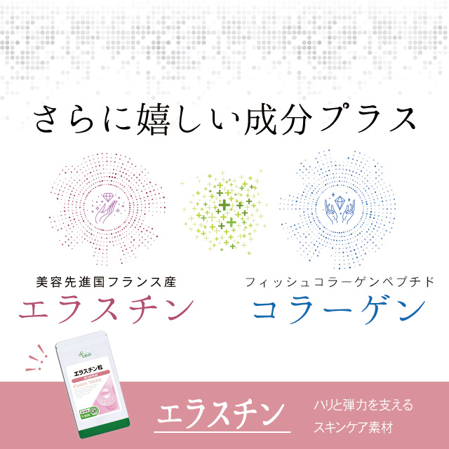 | 原材料 | エラスチン加水分解物(フランス産)、フィッシュコラーゲンペプチド/セルロース |