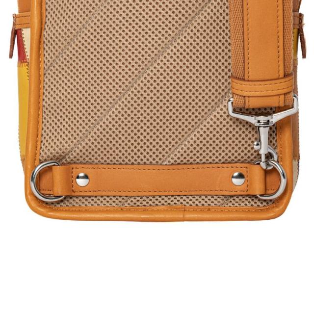 左右どちらでも持てるよう、背面下部にショルダーベルトが付け替え可能なDカン付き。さらに背面はメッシュ素材を採用し、長時間着用した際も蒸れを軽減します。