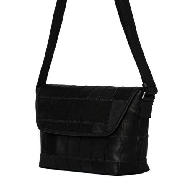 シックな色合いながらパッチワークの個性的なデザインが効いた、たっぷりとした収納力が魅力のレザーショルダーバッグ。普段使いはもちろん日帰り旅行などにも使えて便利。