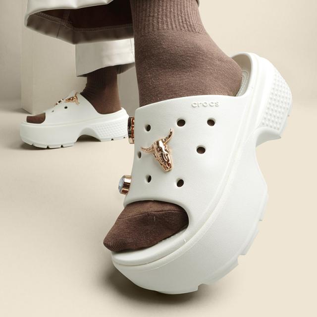 スタイリッシュにパワーアップした大胆なソールデザインが特徴。パーソナライズの魅力を全部詰め込んだストンプ コレクションが、コーディネートをさらに印象的にパワーアップ。ジビッツチャームでオリジナルの1足にカスタマイズ可能
