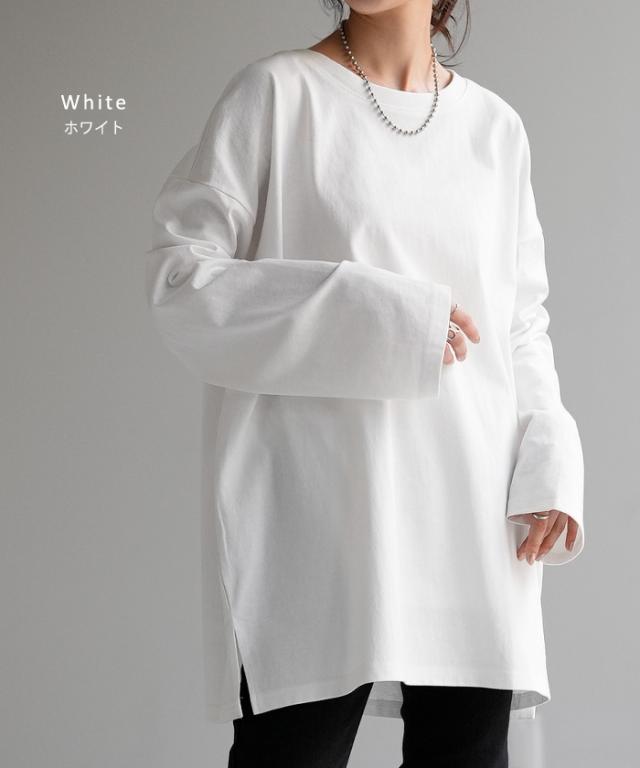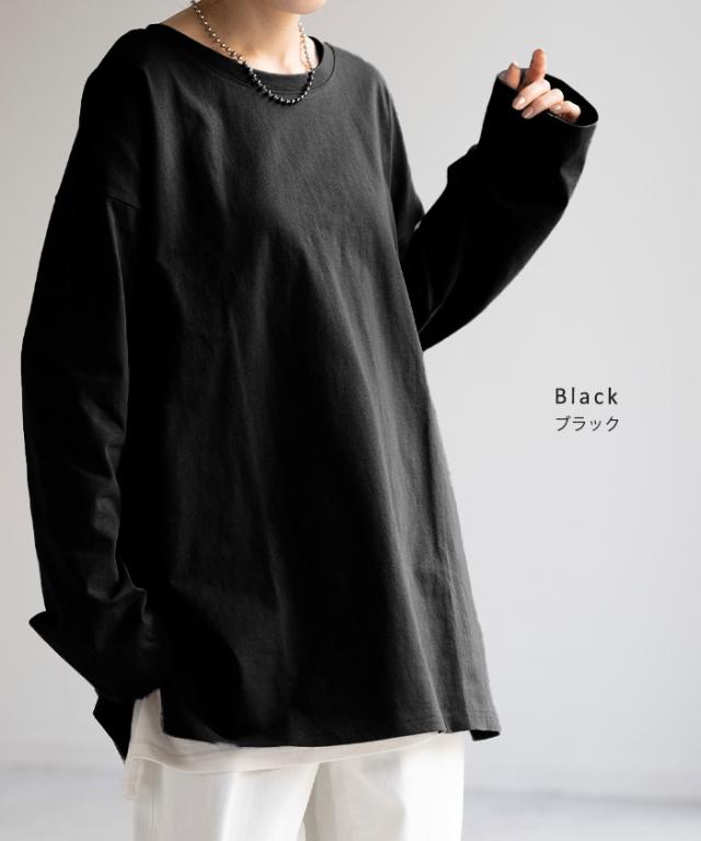 ロンT 綿100% レディース カットソー ティーシャツ 無地 長袖 Tシャツ ロング チュニック ビッグ ドルマン ルーズ 大きいサイズ きれいめ トップス ドルマン Uネック 長い 体型カバー 大人 お洒落 お尻が隠れる ベーシック ブラック 白 春 夏 HUG.U 秋新作