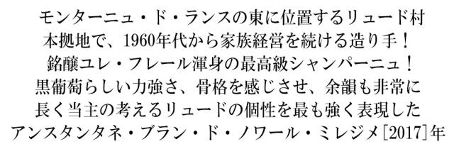 モンターニュ・ド・ランスの東に位置するリュード村 本拠地で、1960年代から家族経営を続ける造り手! 銘醸ユレ・フレール渾身の最高級シャンパーニュ! 黒葡萄らしい力強さ、骨格を感じさせ、余韻も非常に 長く当主の考えるリュードの個性を最も強く表現した アンスタンタネ・ブラン・ド・ノワール・ミレジメ[2017]年