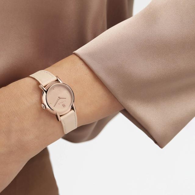 手元を華奢に演出する24mmの小さめサイズのケースを採用し、上品なカラーが腕に馴染み大人の手元を彩ります。また、文字盤とベルトに、上質なイタリアンレザーを使用したエレガントなデザインが、フェミニンなスタイルはもちろん、いつものカジュアルスタイルもグッと格上げされます。