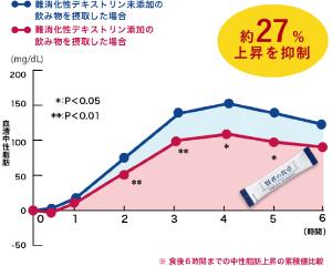 ![]() | 難消化性デキストリンの一つ目の働きは食後の血中中性脂肪上昇抑制作用。 ファーストフードと一緒に難消化性デキストリン5gを配合した飲料を摂取した場合、配合していない飲料を摂取した場合と比べて食後の血中中性脂肪値の上昇をおだやかにすることが認められました。 被験者:健常成人13名 [出典:European Journal of Nutrition,46(3),133-138(2007)] 食事の内容や個人差により、すべての方がこのような結果になるとは限りません。 |
