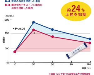 ![]() | 難消化性デキストリンのもう一つの働きは、食後の血糖値上昇抑制し、血糖値の上昇をおだやかにする作用。 うどん定食と一緒に難消化性デキストリン5gを配合したお茶を摂取した場合、普通のお茶と一緒に摂取したときに比べて食後の血糖値の上昇がおだやかになる事が認められました。 被験者:健常成人男性10名 [出典:日本食物繊維研究会誌 3.13-19 (1999)] 食事の内容や個人差により、すべての方がこのような結果になるとは限りません。 |