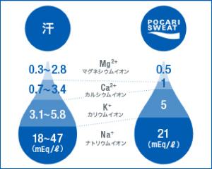 ![]() | 人の身体は60%近くが水分で構成され、水分(体液)には真水だけではなく、ナトリウムなどの様々なイオン(電解質)が含まれています。 大量の汗をかくことで水分と一緒にナトリウムも失うので、身体の中のイオンバランスが崩れてしまい健やかな生活を送ることが出来なくなります。 ポカリスエットは体液に近いイオンバランスの飲料なので、水にくらべて身体の外に排出されにくく、長い時間にわたって身体を潤し続ける事ができます。 その上、ナトリウムやカリウムなどのイオン(電解質)を適切な濃度で含んでいるので、身体に負担をかけることなく、すばやく水分を吸収することができるのです。 |