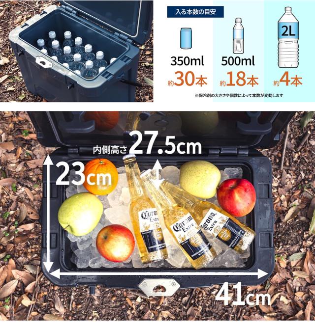 ●容量目安(ペットボトル500mlの場合:約18本、ペットボトル2Lの場合:約4本(横向き)、350ml缶の場合:約30本)※自社調べ、保冷剤などの状況により変動します。