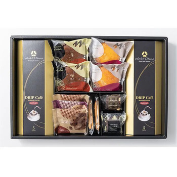 商品内容:マドレーヌ(プレーン・チョコ)・レーズンサンド・チョコチップクッキー・ドリップ珈琲リッチマイルド40g(8g×5袋)×各2個、ブラウニードライフルーツ&ナッツ・レーズンクッキー・チョコレートケーキ×各1個