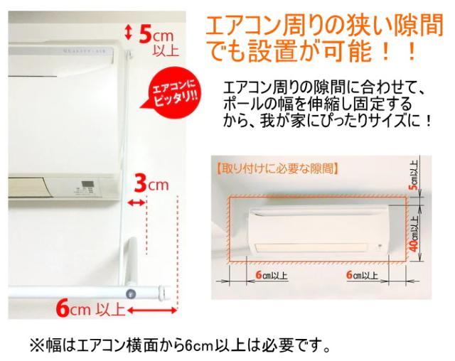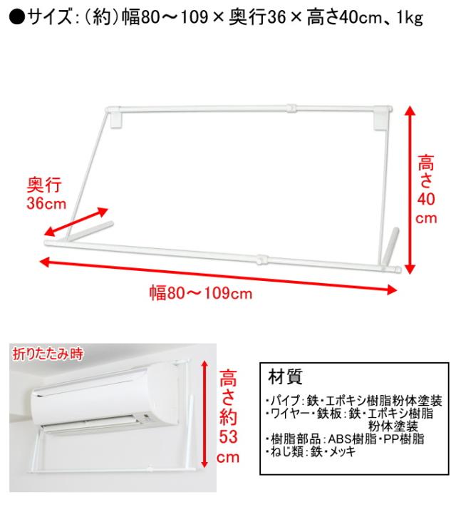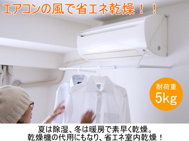 エアコンの幅に合わせて調節可能な伸縮タイプ! エアコンに引っ掛けるだけの簡単設置。 夏は除湿、冬は暖房で洗濯物を素早く乾かせます! 使用後は折り畳めるので邪魔になりません。 耐荷重は約5kgです。 |