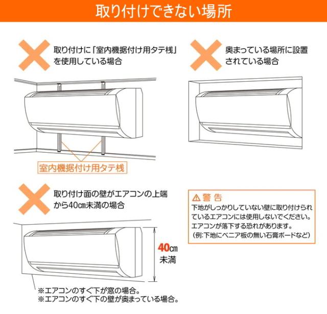 取り付けに「室内機据付き用タテ桟」を使用している場合。 取り付け面の壁がエアコンの上端から40cm未満の場合。 エアコンを奥まっている場所に設置している場合。 エアコンのすぐ下が窓の場合。 エアコンのすぐ下の壁が奥まっている場合など ※下地がしっかりしていない壁に取り付けられているエアコンには使用しないでください。エアコンが落下する恐れがあります。 (例:下地にベニヤ板の無い石膏ボードなど) |