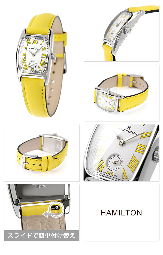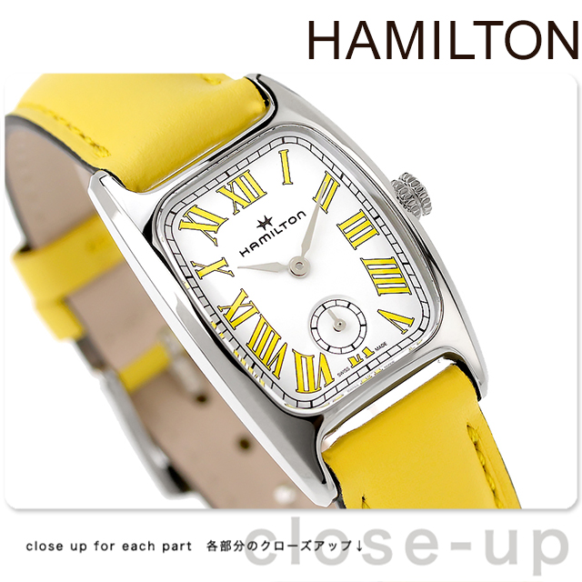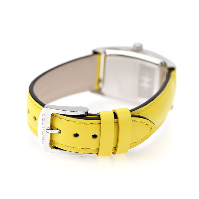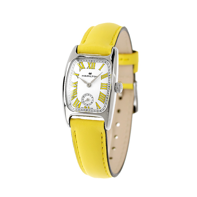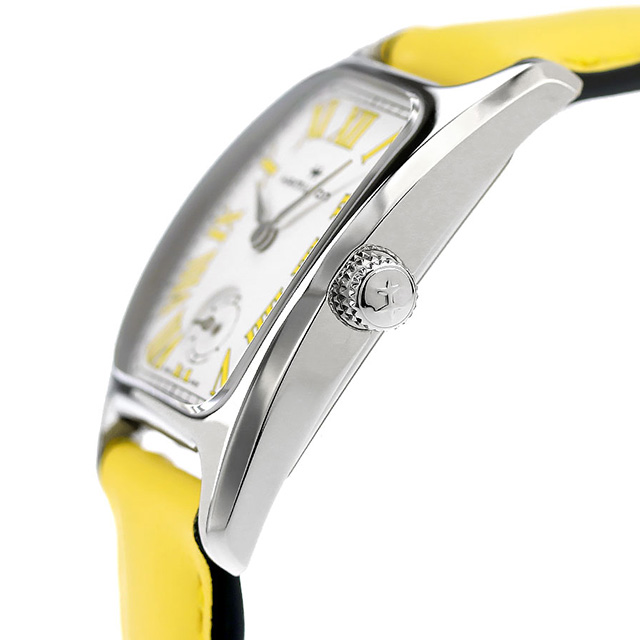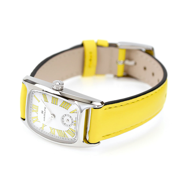 3年保証キャンペーン ハミルトン アメリカンクラシック ボルトン スモールセコンド クオーツM 23.5mm スイス製 レディース 腕時計 H13321812 HAMILTON AMERICAN CLASSIC BOULTON SMALL SECOND QUARTZ M アナログ ホワイト レモンイエロー 白 ◆HAMILTON(ハミルトン)はアメリカ発祥の老舗ブランドです。創業翌年に誕生した懐中時計「ブロードウェイ・リミテッド」は、他の時計よりも正確に時を刻むことから鉄道用時計として採用されました。その後も航空用時計や軍用時計として採用されるなど、品質の高さと流行にながされない独自のデザインが世界中の人々に支持されています。 巧みにカーブしたケースシェイプと独特なアールデコスタイルのハミルトンの「ボルトン」は、定番のマカロンフレーバーに着想を得た大胆なカラーで生まれ変わります。ローマ数字がこのタイムピースの美しいパールホワイトダイヤルを引き立て、数字と同色のレモンイエローのレザーストラップが魅力を高めます。