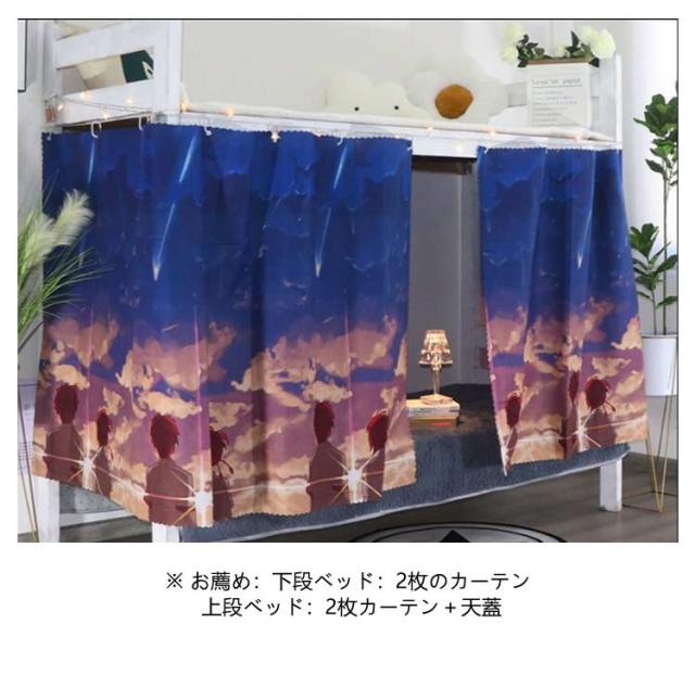 | 二段ベッド用 間仕切りカーテン。繰り返す利用可能の学生寝室ベッドカーテンです。 1枚が1面を遮る、2枚が3面を遮る、3枚が4面を遮る。1.2m高度と1.5m高度の天蓋が同じです。 ※ お薦め:下段ベッド:2枚のカーテン 上段ベッド:2枚カーテン+天蓋 厚手で遮光性が抜群、快適な睡眠環境を演出してくれます。 取り付け用のひもとフックが付いており、ベッドの四周に掛けるだけでいいです。 | |