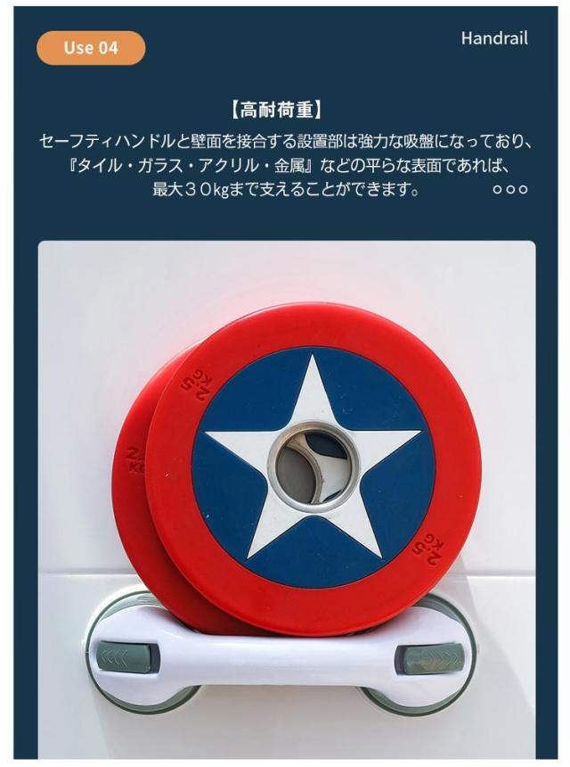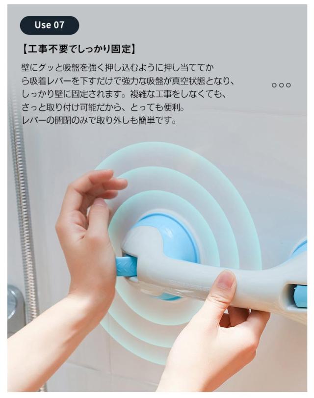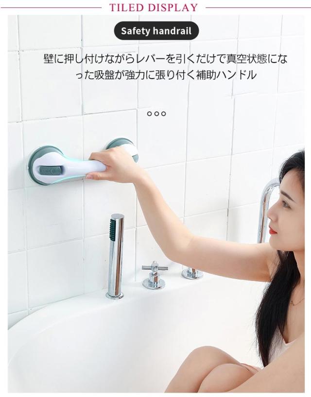 | 立ち上がりの補助・転倒防止に 吸盤式ドアハンドル 工具不要 強力真空吸盤 耐荷重約40kg 壁に押し付けながらレバーを引くだけで真空状態になった吸盤が強力に張り付く補助ハンドル 【細部までこだわった設計】 本製品は、浴槽で使用できるタイプです。「水・熱」に強く、壁にもしっかりとくっついて簡単には取れません。 また、グリップも滑りにくいように加工されており、握りやすい設計です。角がある箇所を全て排除し、商品全体に丸みを帯びさせているので、万が一、ぶつかったとしてもケガをしにくい安全設計になっております。 【高耐荷重】 セーフティハンドルと壁面を接合する設置部は強力な吸盤になっており、『タイル・ガラス・アクリル・金属』などの平らな表面であれば、最大30kgまで支えることができます。 【工事不要でしっかり固定】 壁にグッと吸盤を強く押し込むように押し当ててから吸着レバーを下すだけで強力な吸盤が真空状態となり、しっかり壁に固定されます。複雑な工事をしなくても、さっと取り付け可能だから、とっても便利。レバーの開閉のみで取り外しも簡単です。 吸盤を貼り付ける調整も、レバーを上下することにより簡単に行えます。 【繰返し使えます】 吸盤部分を水洗いし、乾燥させると吸盤の粘着力が回復しますので、繰り返しご使用いただけます。 【幅広い適用シーン】 キッチン・バスルーム・リビングルーム・トイレ、他、玄関先や脱衣所などあらゆる場所に設置可能。高齢者の補助ハンドルからお子様まで。 コンパクトな設計で「取り付け・取り外し」が行えますので旅行や外出先でもご使用下さい。 | |