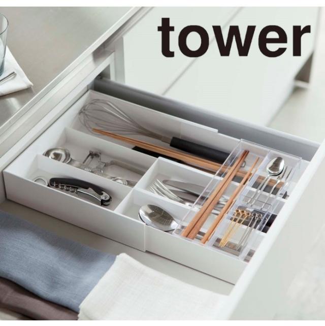 tower 伸縮&スライド カトラリートレー ホワイト 3382 送料無料