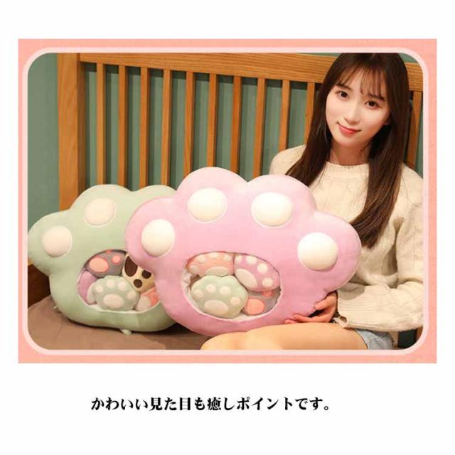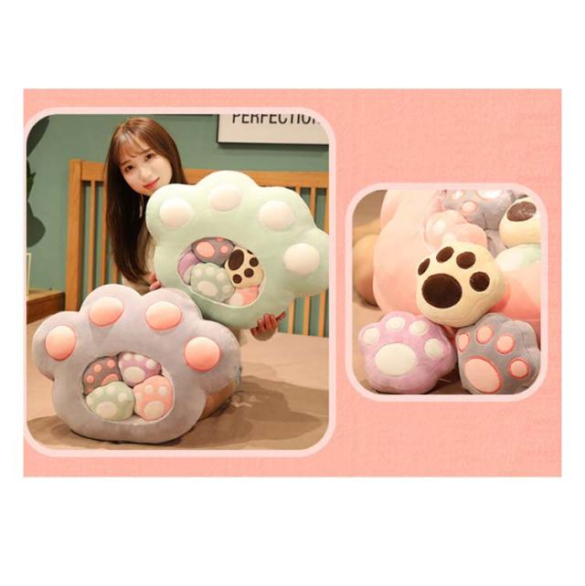 | 5つのミニ肉球のぬいぐるみがついてる!もちもち肉球のぬいぐるみ もちもち生地で弾力もあるのでクッションとしても心地よく使えます♪ かわいい見た目も癒しポイントです。 ファスナー留めだから中のミニぬいぐるみが取り出せます。 | |