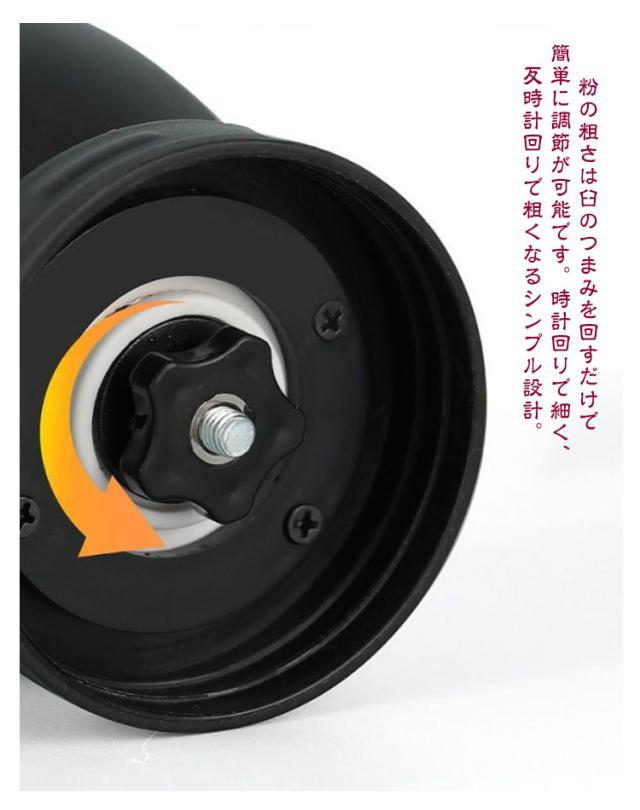 | ミル部はセラミックで、金属臭がなくコーヒー本来の風味を損ないません。 粉の粗さは臼のつまみを回すだけで簡単に調節が可能です。時計回りで細く、反時計回りで粗くなるシンプル設計。 挽いた豆の量が一目でわかる!粉を受ける容器は透明で欲しい豆の量が外からすぐにわかります。 スリムで持ちやすく携帯用に便利!ハンドルはちょうど良い長さで楽々研磨。 滑り止めカバー付きなので安定してコーヒー豆を挽くことができます。 コンパクトなサイズで持ち運びも便利!ハイキング、アウトドア、バックパッキング旅行に最適。 | |