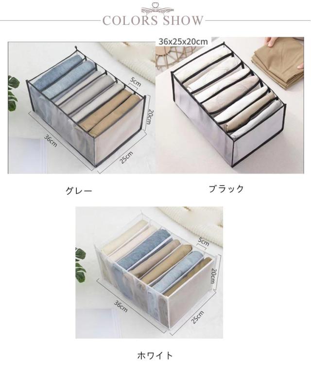 | ・靴下やズボン・ストッキングなど、小物整理にもおすすめの収納ケース。 ・通気性に優れたメッシュ生地はこもりがちな湿気を逃す為、安心してクローゼットやタンスに収納できます。 ・タンス・クローゼット・押し入れ・ベッド下の整理整頓や引き出し内のインナーボックスとしてもオススメです♪ ・使わない時も折り畳むことができ、コンパクトで省スペースとなります。 | |