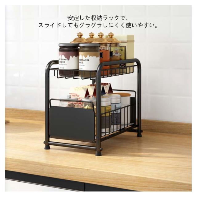 シンク下収納 伸縮 スライド式 スライドラック 収納棚 ラック 2段 ラック シンク下収納 キッチン収納 キッチン下 台所収納 シンプル ブラック ホワイト シンク下スライドラック 多機能 調味料 収納 ボトルラック 洗面台下 収納